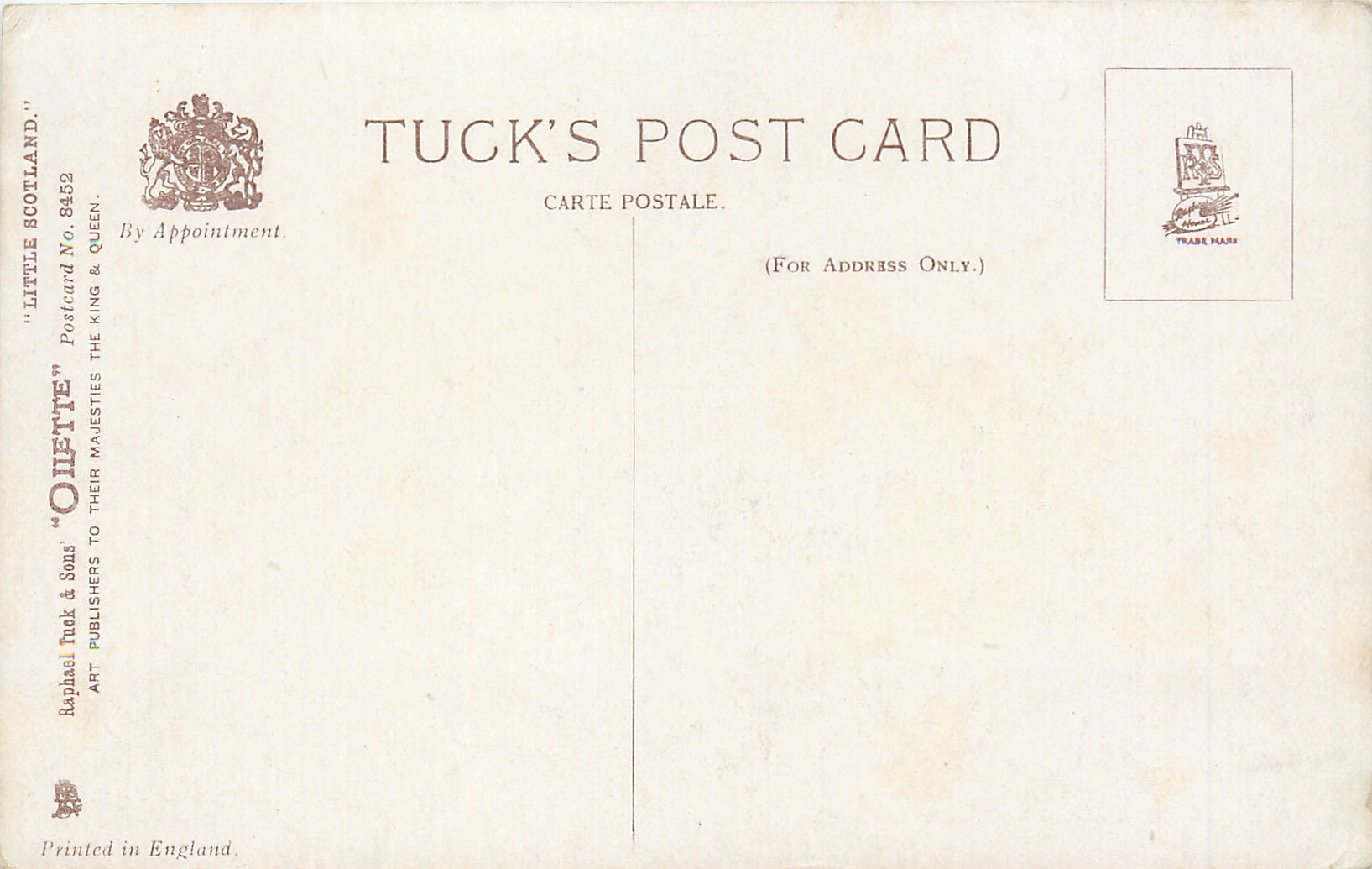 SCOTLAND FOR EVER! boy salutes, framed by horseshoe laden with ivy and forget-me-nots