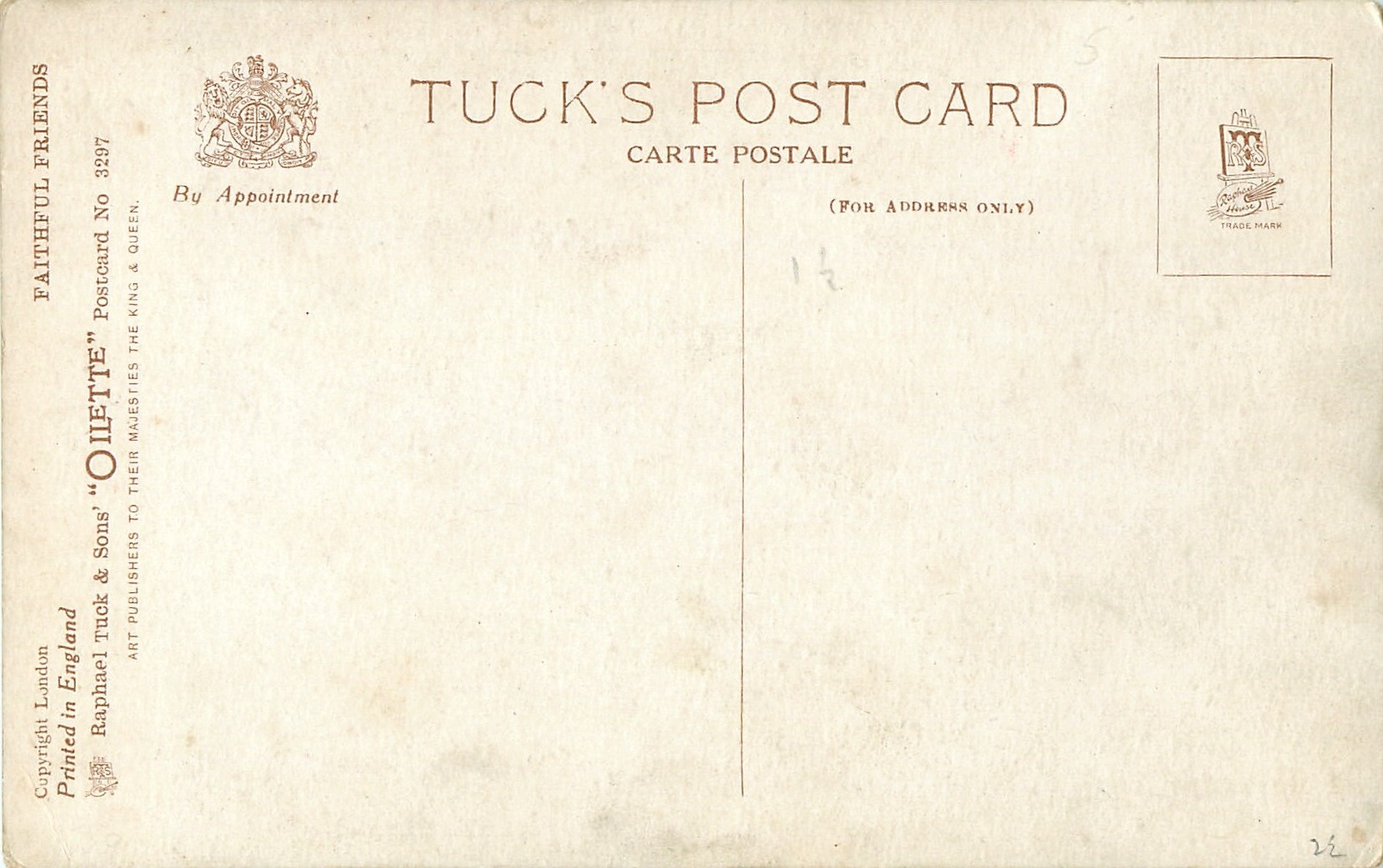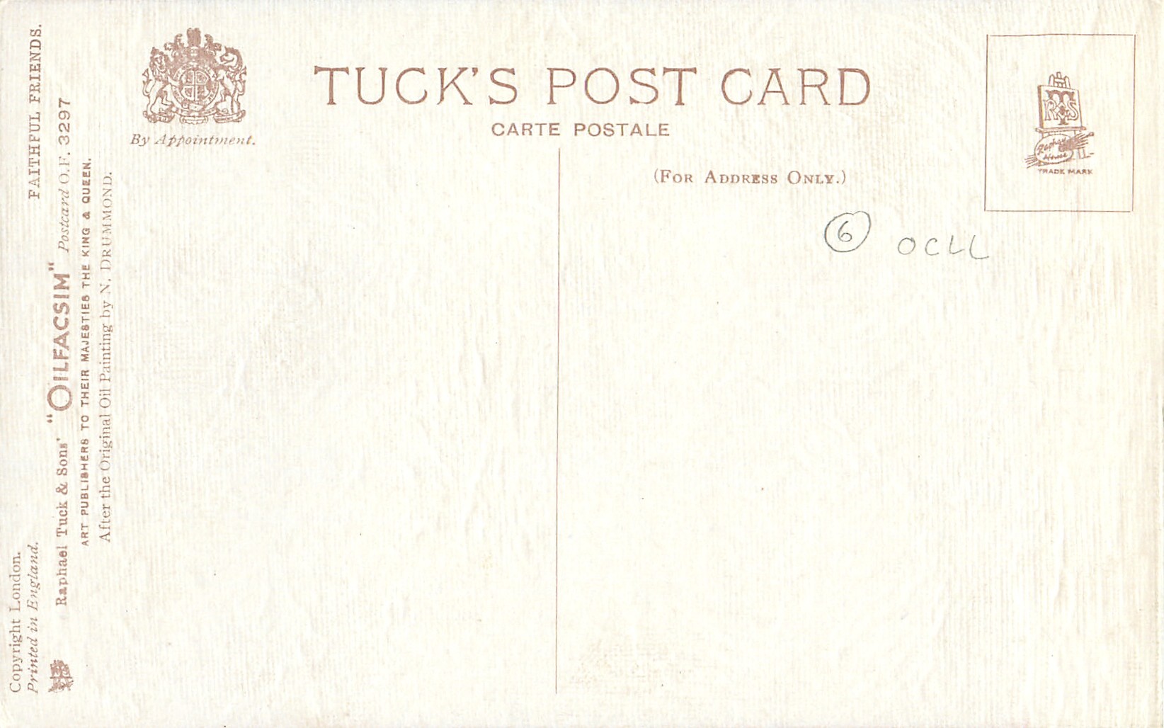 OILETTE, PRINTED IN ENGLAND, COPYRIGHT LONDON, 3 backs, come OILFACSIM with O/F prefixes, come O/F but not so trade named, with or w/o AFTER THE ORIGINAL OIL PAINTING BY N. DRUMMOND., listed in 1926/1927 Postcard Catalogue,
