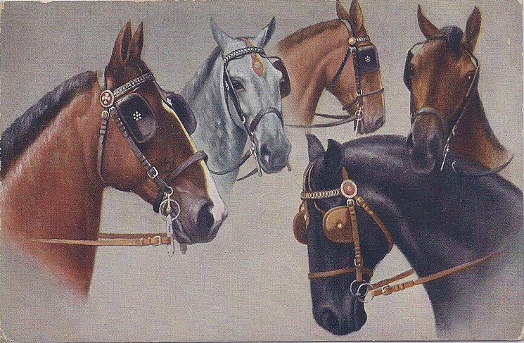 three chestnut horses, one black horse, and one grey horse, all have blinders on eyes