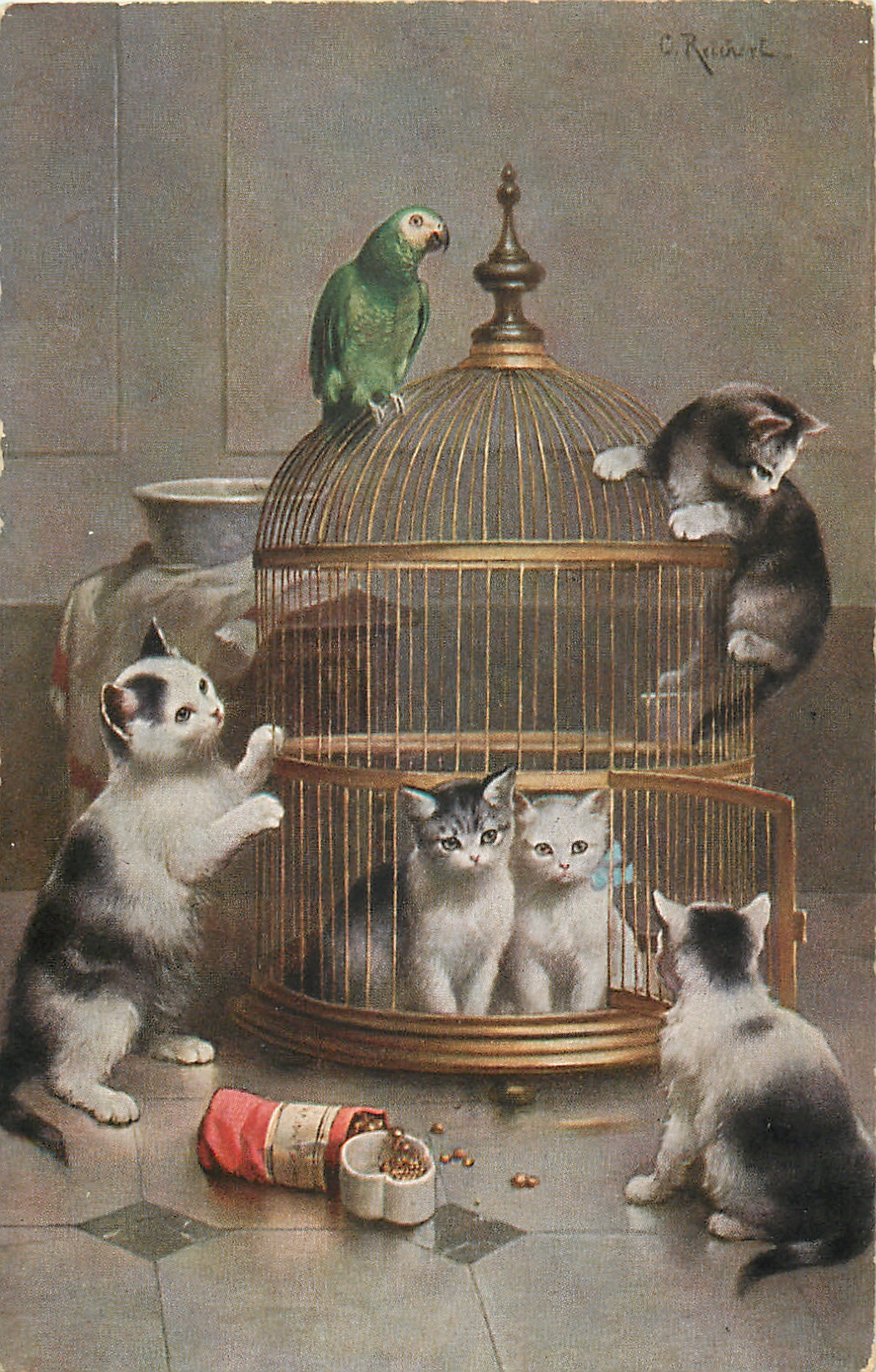 five cats, two in parrot cage