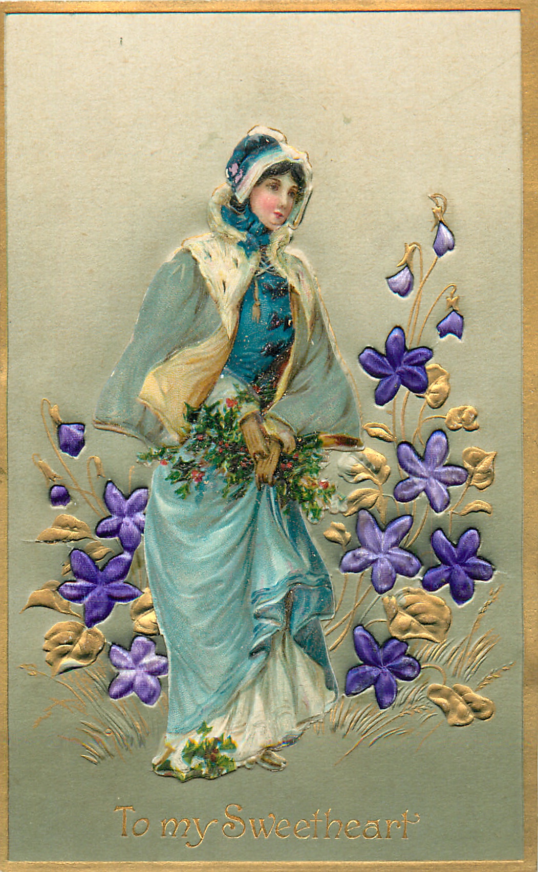 TO MY SWEETHEART(green background) girl in blue dress, violets both sides