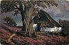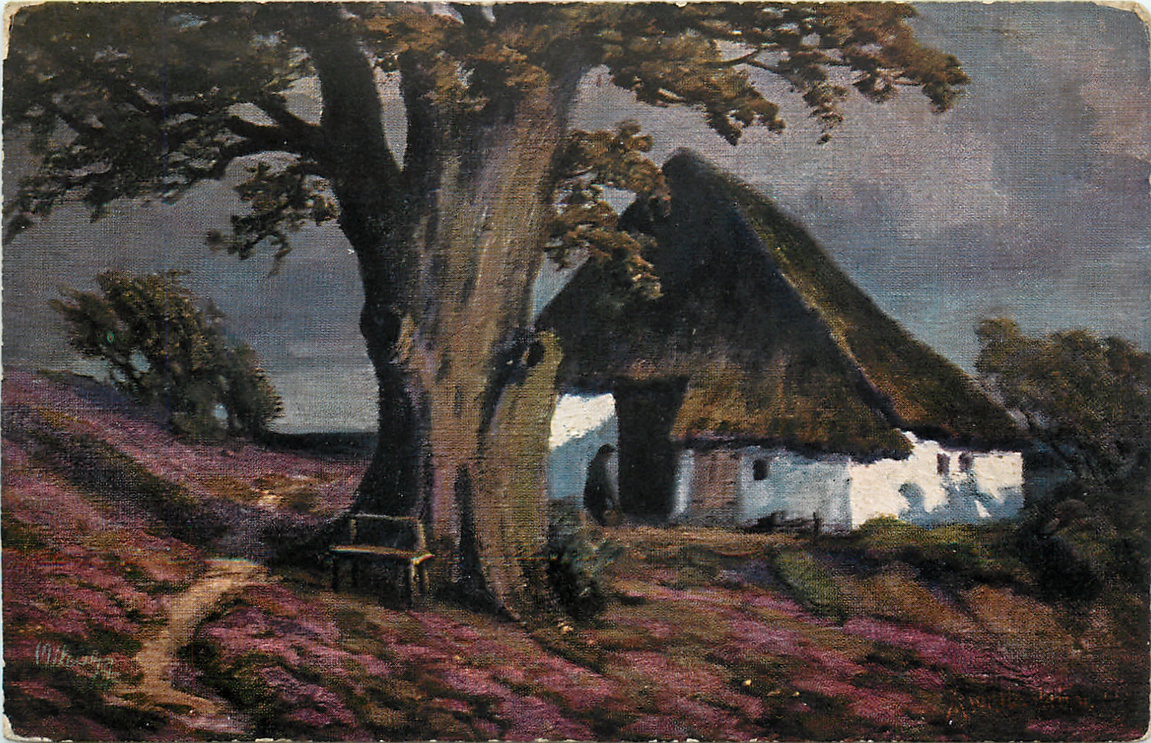 thatched cottage behind huge tree, bench before tree, path to left of tree