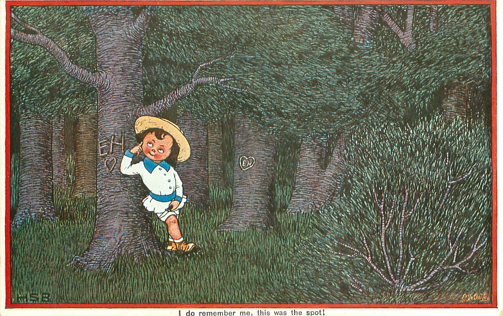 I DO REMEMBER ME, THIS WAS THE SPOT! young girl stands by tree on which she has carved initials & heart, looking front, dwarfed by dense forest, very large trees