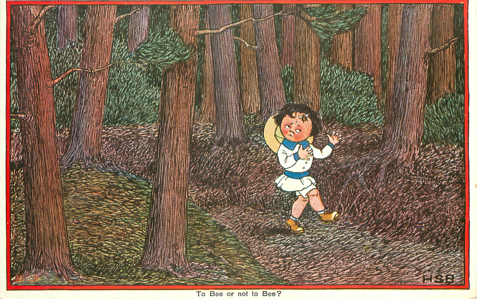 TO BEE OR NOT TO BEE? young girl scared by a bee, dwarfed by dense forest, very large trees