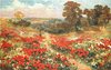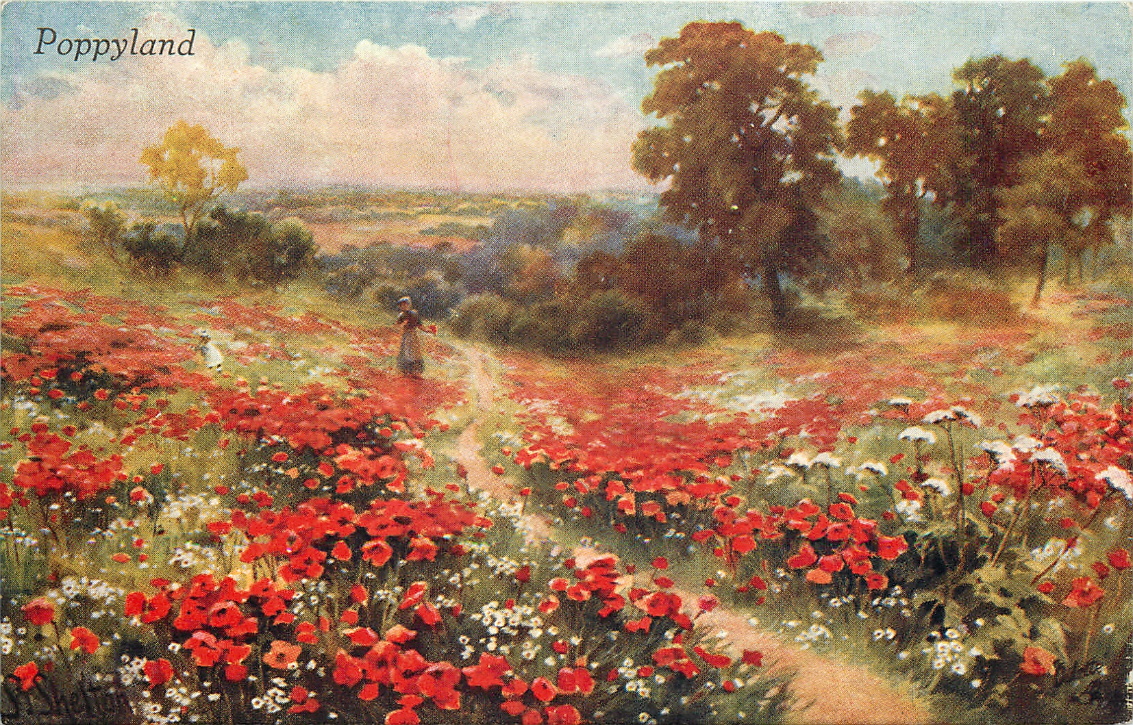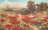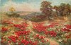 woman watching child in large field of red poppies, middle path, trees behind