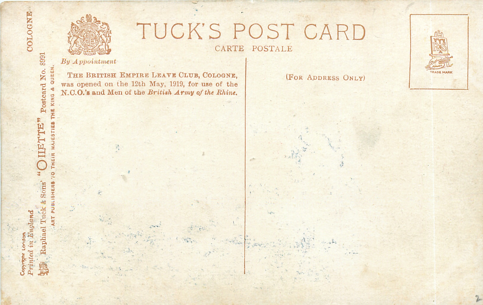 back:- THE BRITISH EMPIRE LEAVE CLUB, COLOGNE, WAS OPENED ON THE 12TH MAY, 1919, FOR USE OF THE N.C.O.'S AND MEN OF THE BRITISH ARMY OF THE RHINE.