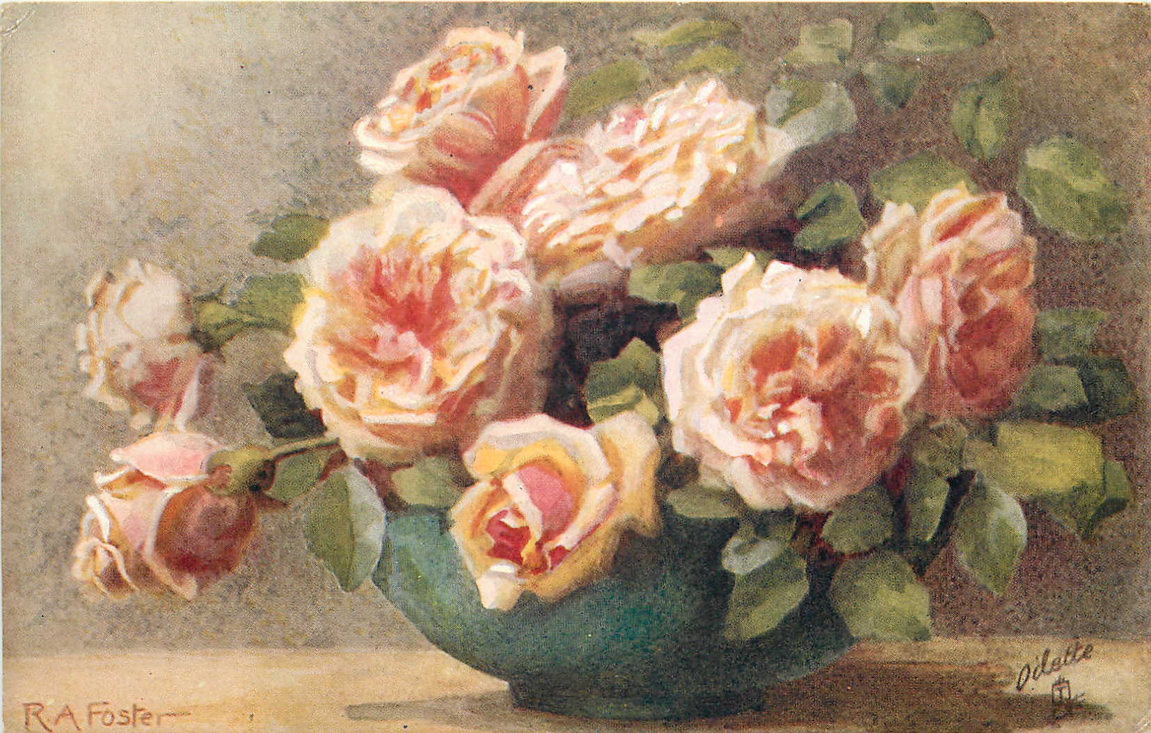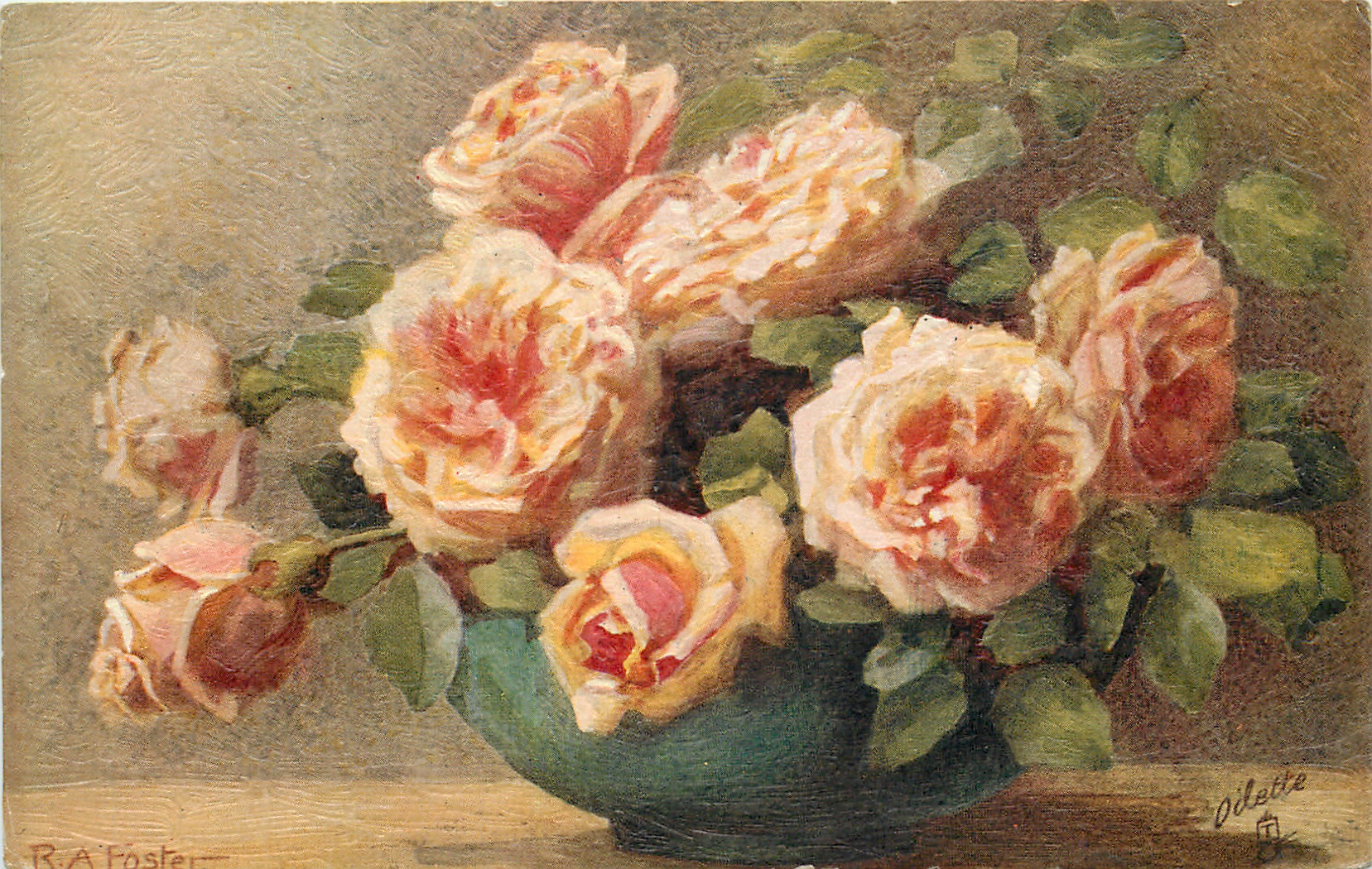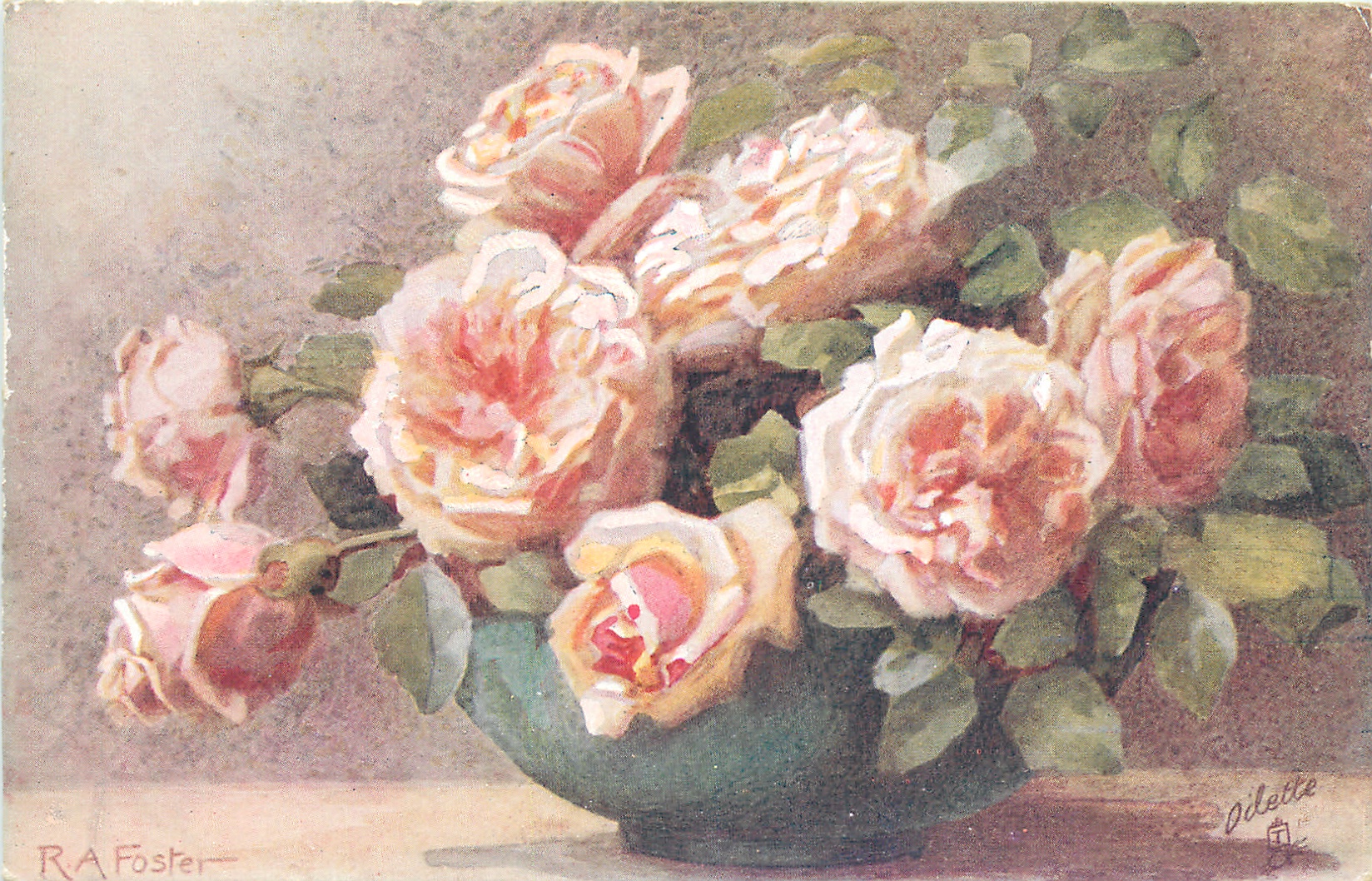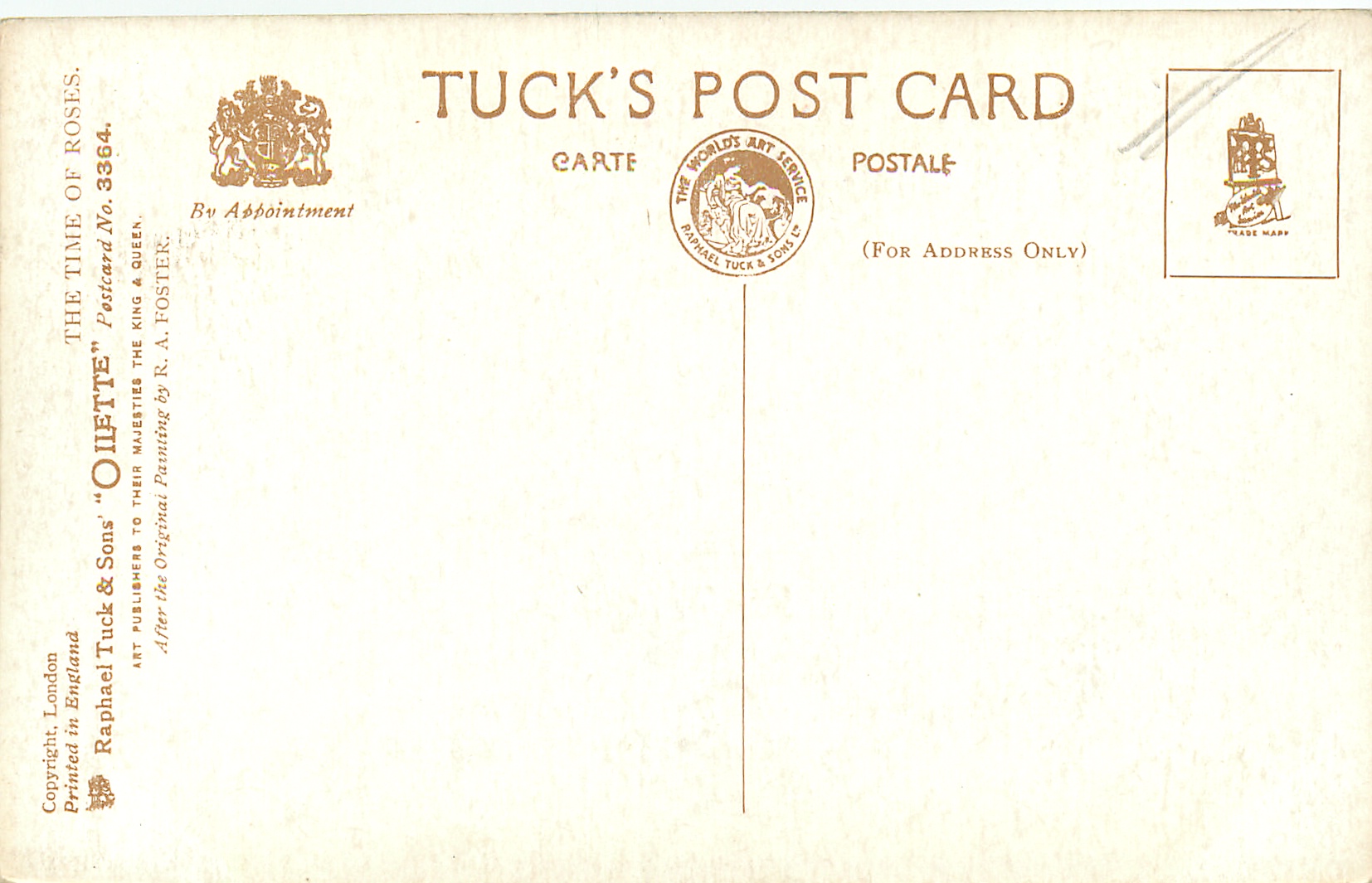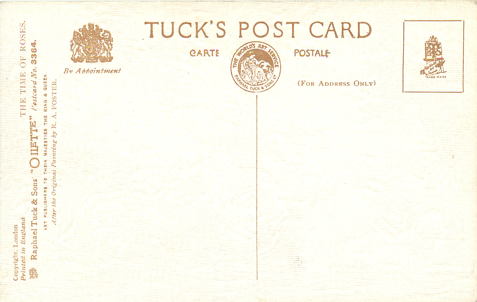 OILETTE, PRINTED IN ENGLAND, COPYRIGHT LONDON, AFTER THE ORIGINAL PAINTING BY R.A. FOSTER..come Oilfacsim but not so trade-named, listed in 1930 Postcard Catalogue