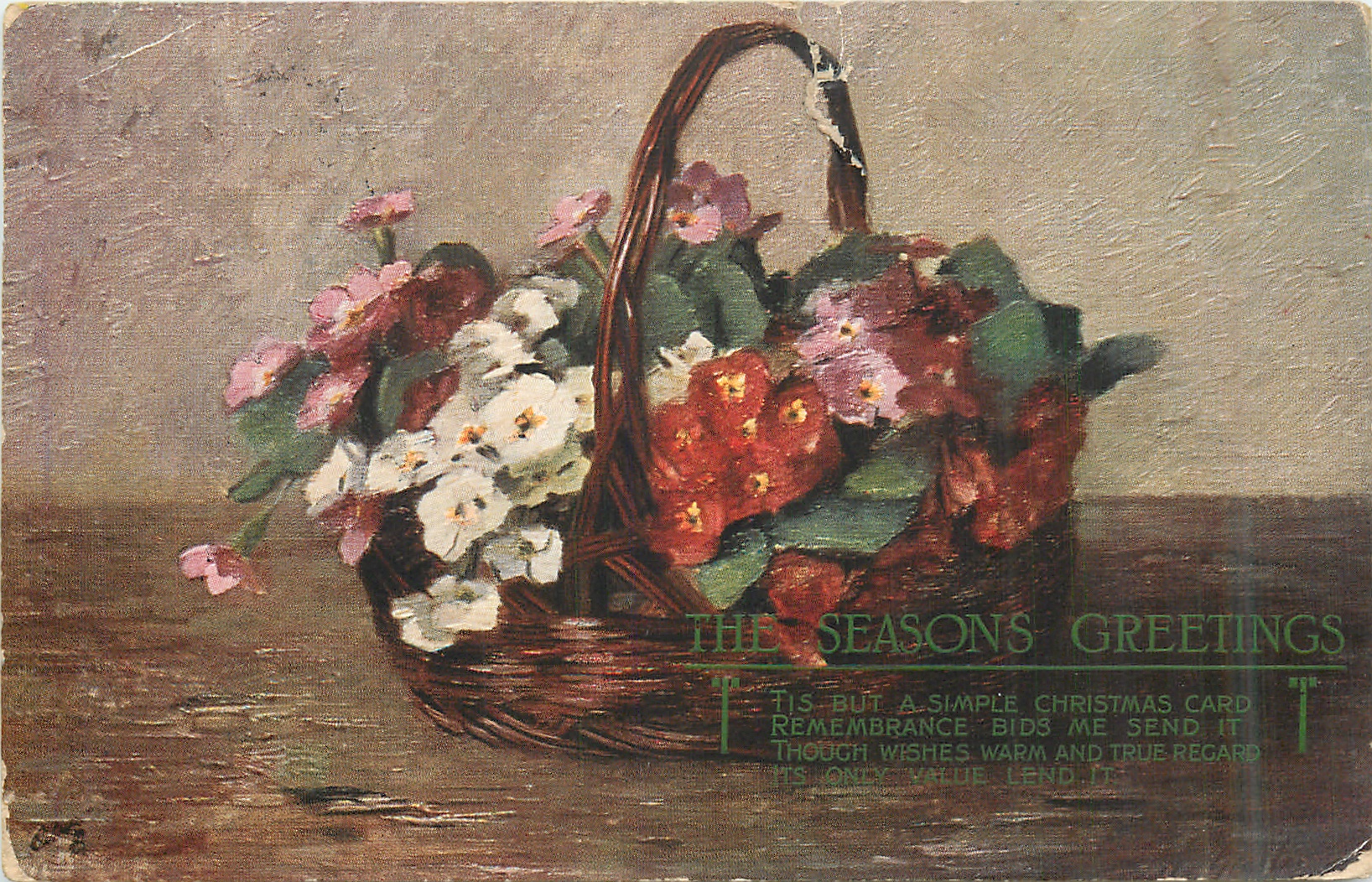 comes opt. in green THE SEASONS GREETING 'TIS BUT A SIMPLE CHRISTMAS CARD, REMEMBRANCE BIDS ME SEND IT THOUGH WISHES WARM AND TRUE REGARD ITS ONLY VALUE LEND IT