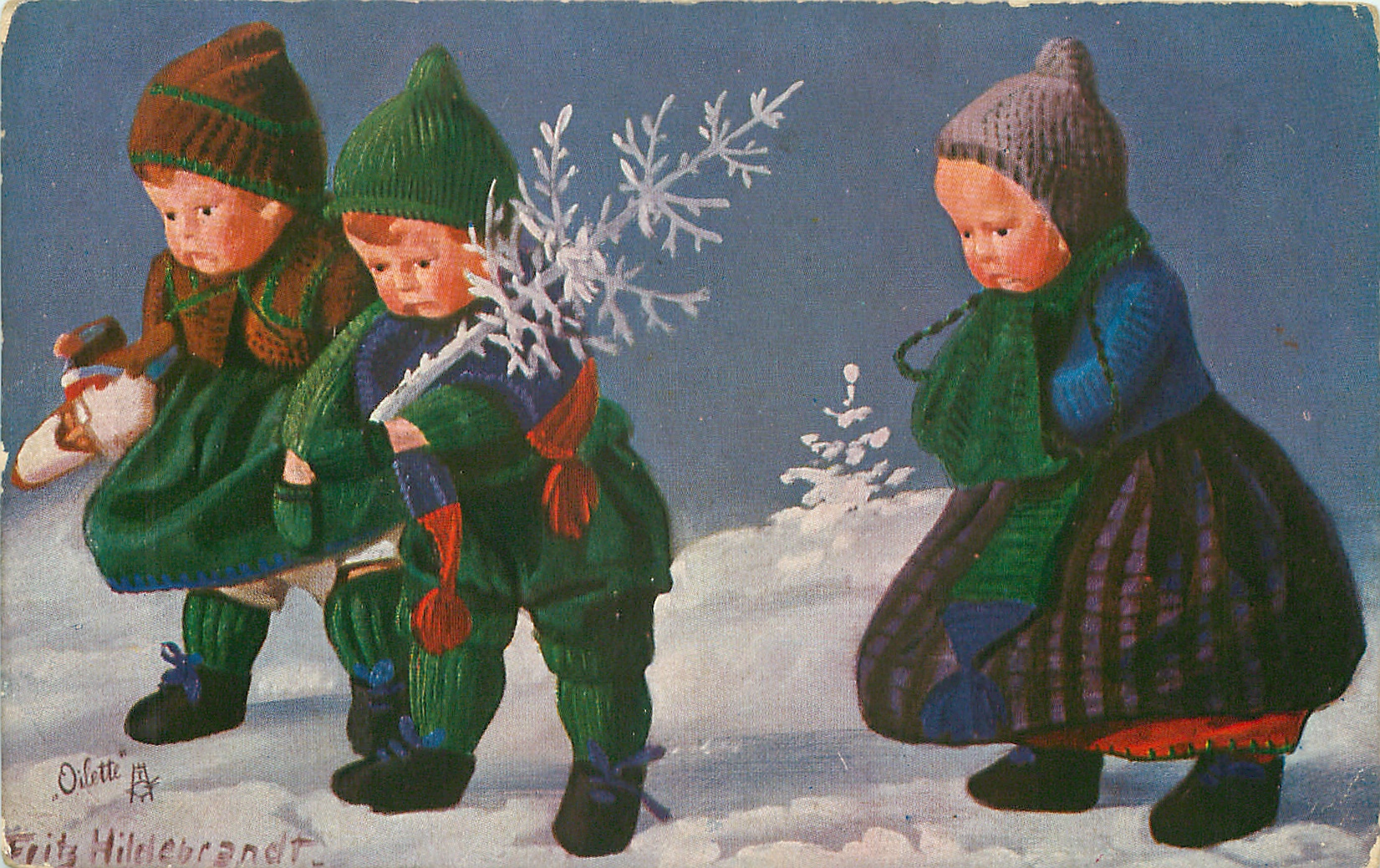 three doll-children walking left, one carrying frosty Xmas tree