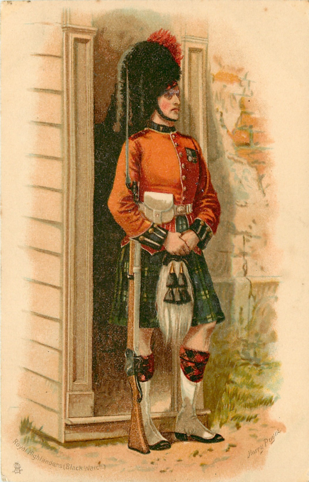 ROYAL HIGHLANDERS (BLACK WATCH) guard with long black hat, red jacket, green kilt