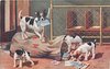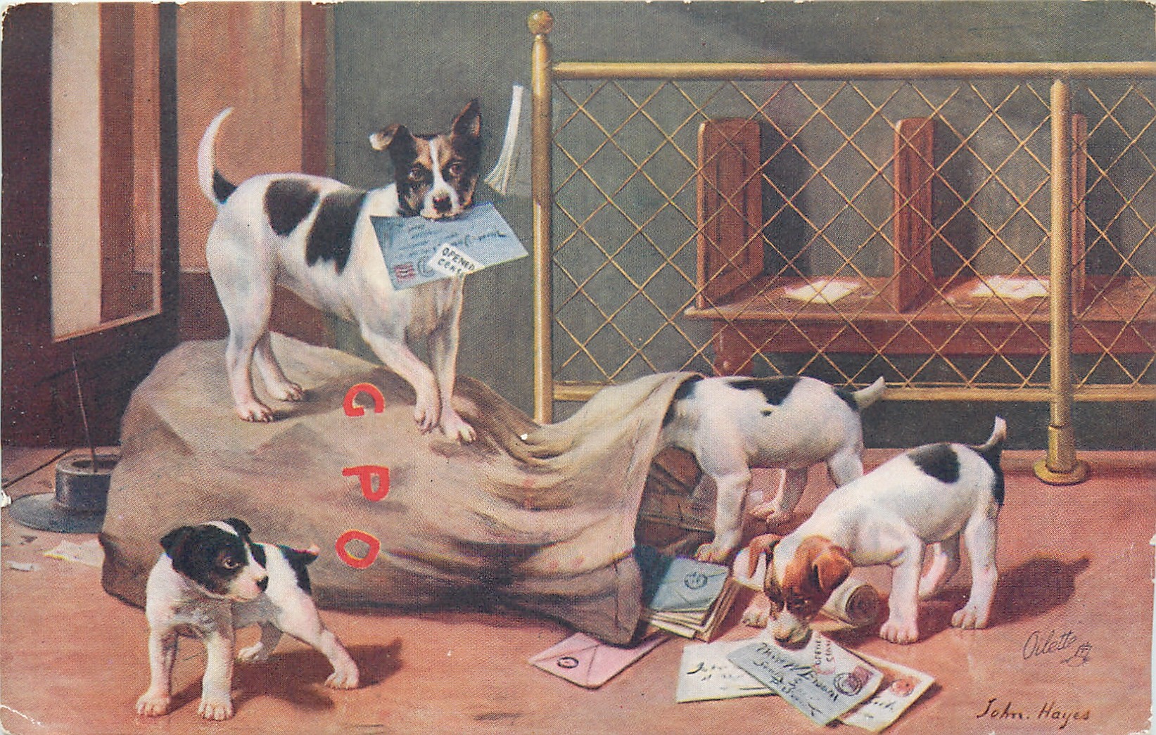 terrier stands on mail bag, censored letter in mouth, three pups play, letters on floor