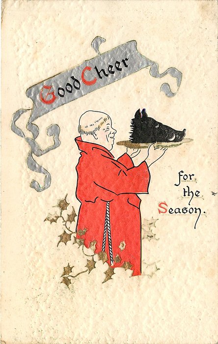 GOOD CHEER FOR THE SEASON, monk bearing boar's head on platter