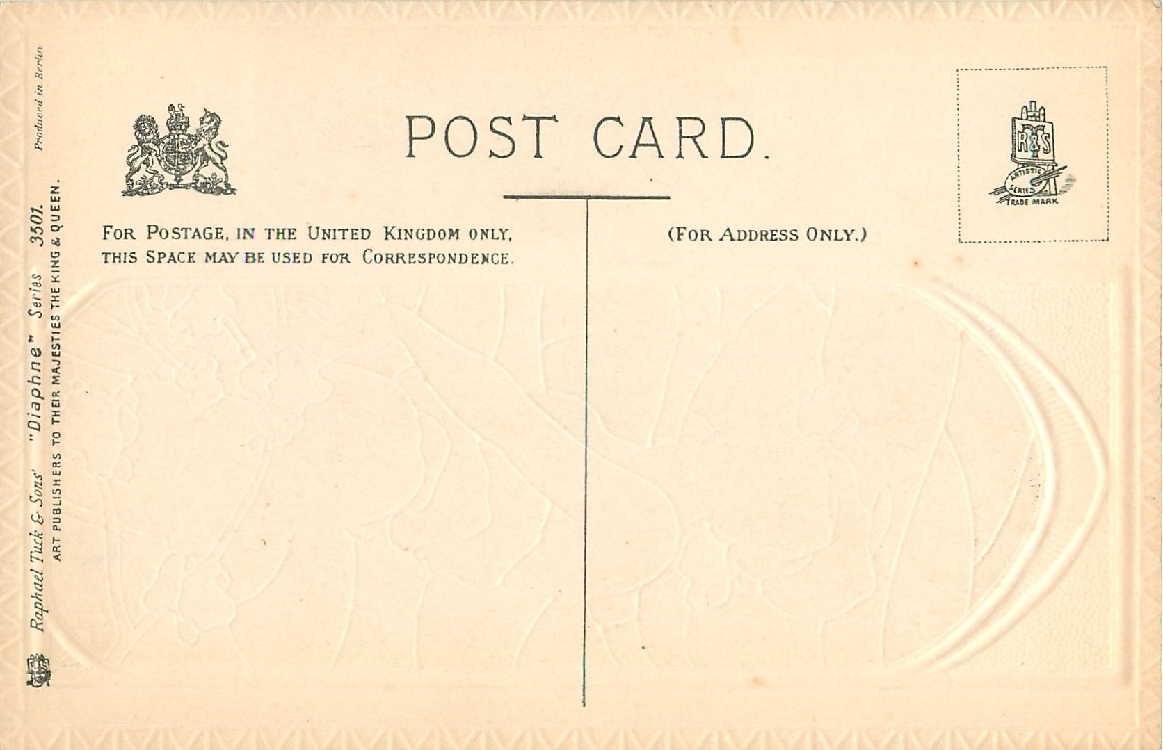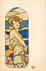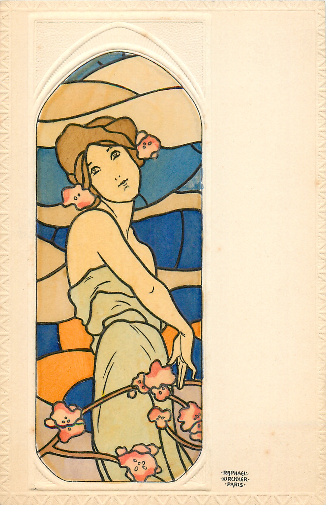 vitraux d'art' celluloid type finish giving glass window effect. Lady looking front over right shoulder, right hand in front of her