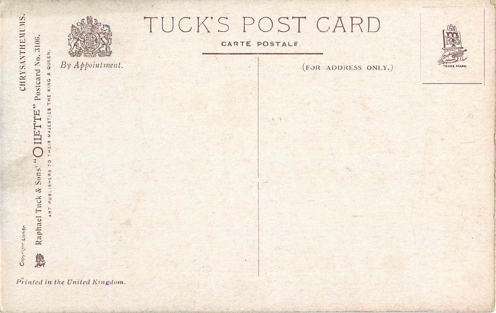 OILETTE, PRINTED IN ENGLAND, COPYRIGHT LONDON or PRINTED IN UNITED KINGDOM; 5 backs, come O/F but not so trade named, listed in 1927/1928 &1930 POSTCARD Catalogues