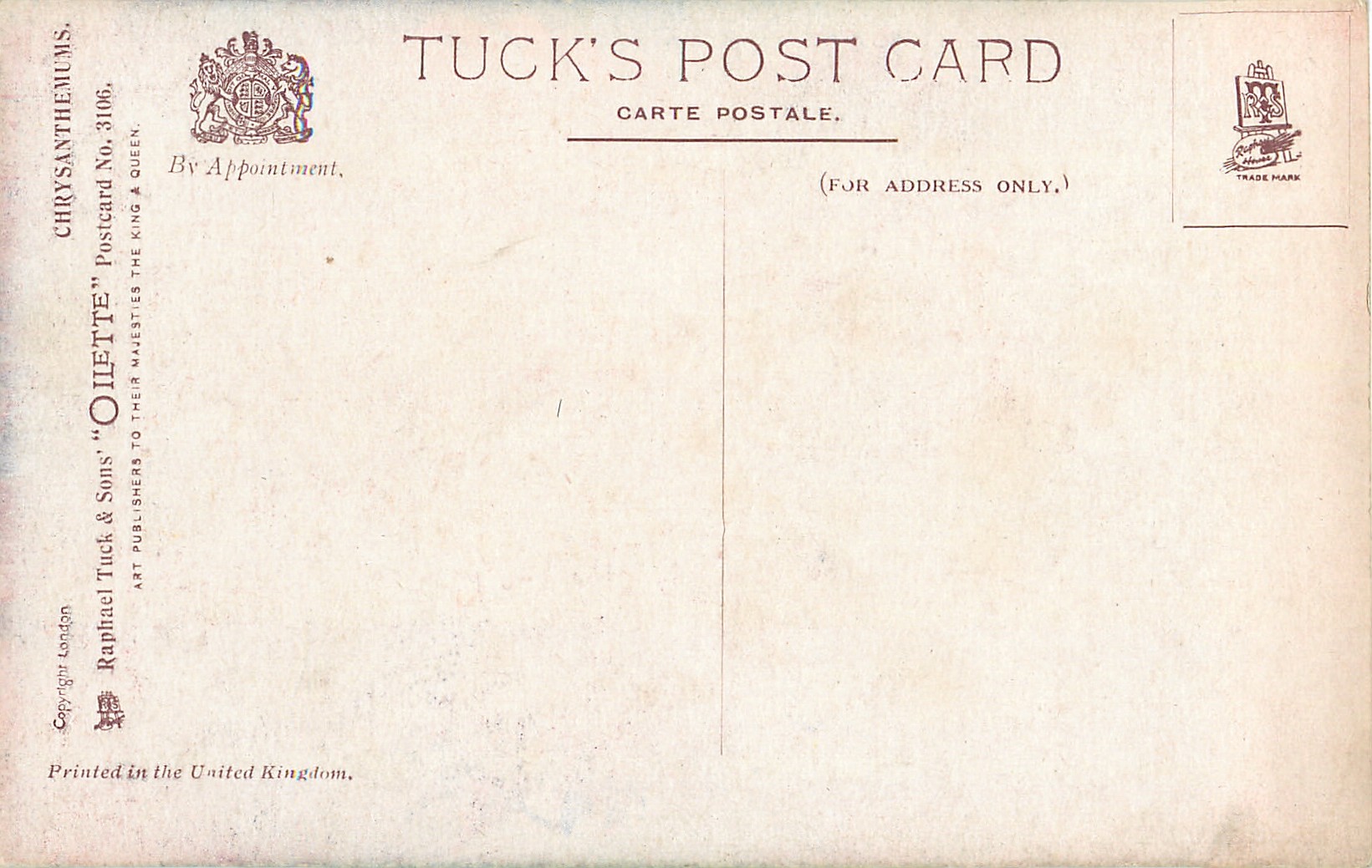 OILETTE, PRINTED IN ENGLAND, COPYRIGHT LONDON or PRINTED IN UNITED KINGDOM; 5 backs, come O/F but not so trade named, listed in 1927/1928 &1930 POSTCARD Catalogues