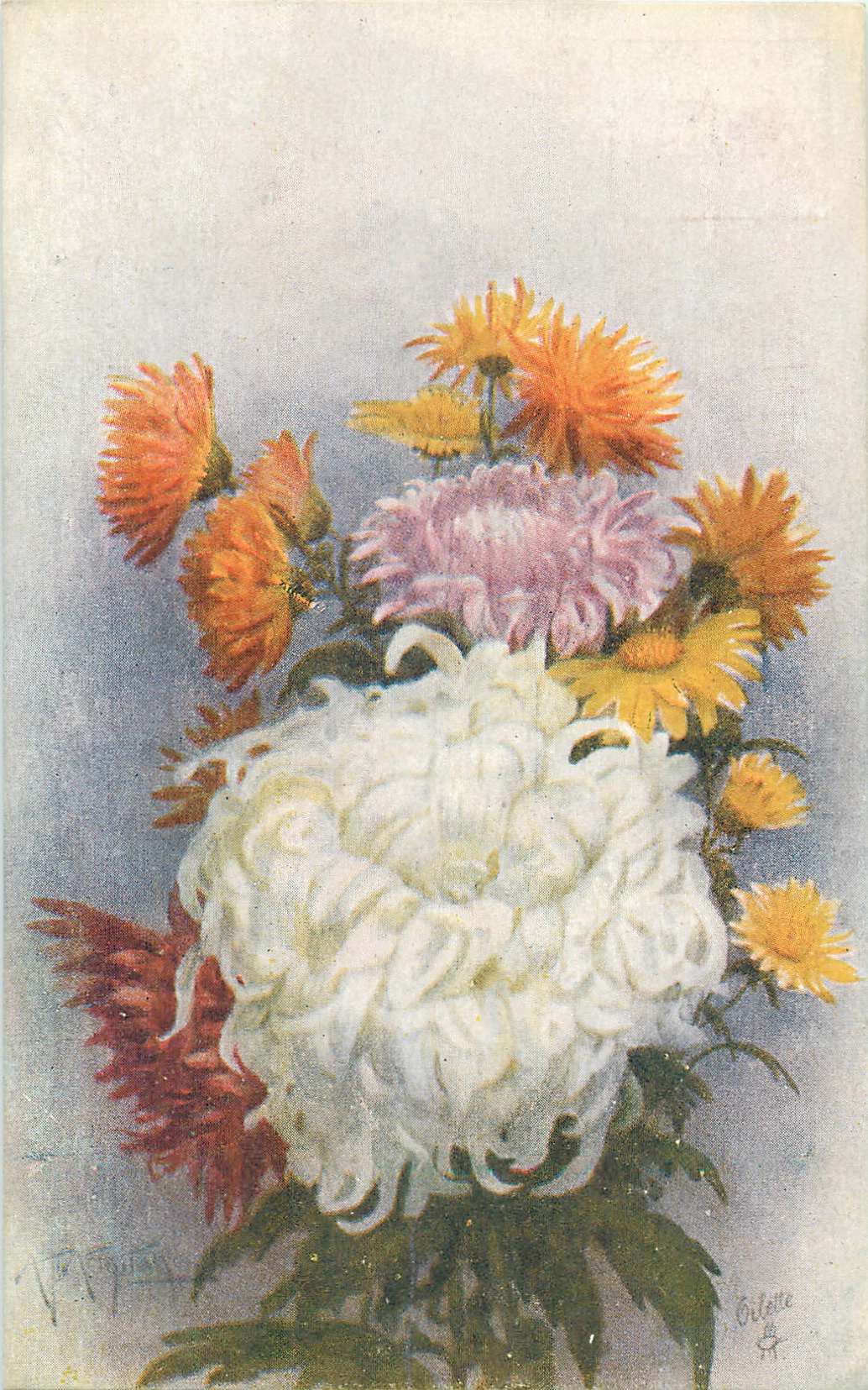 large white mum centre, deep orange lower left, yellow purple & orange mums behind