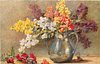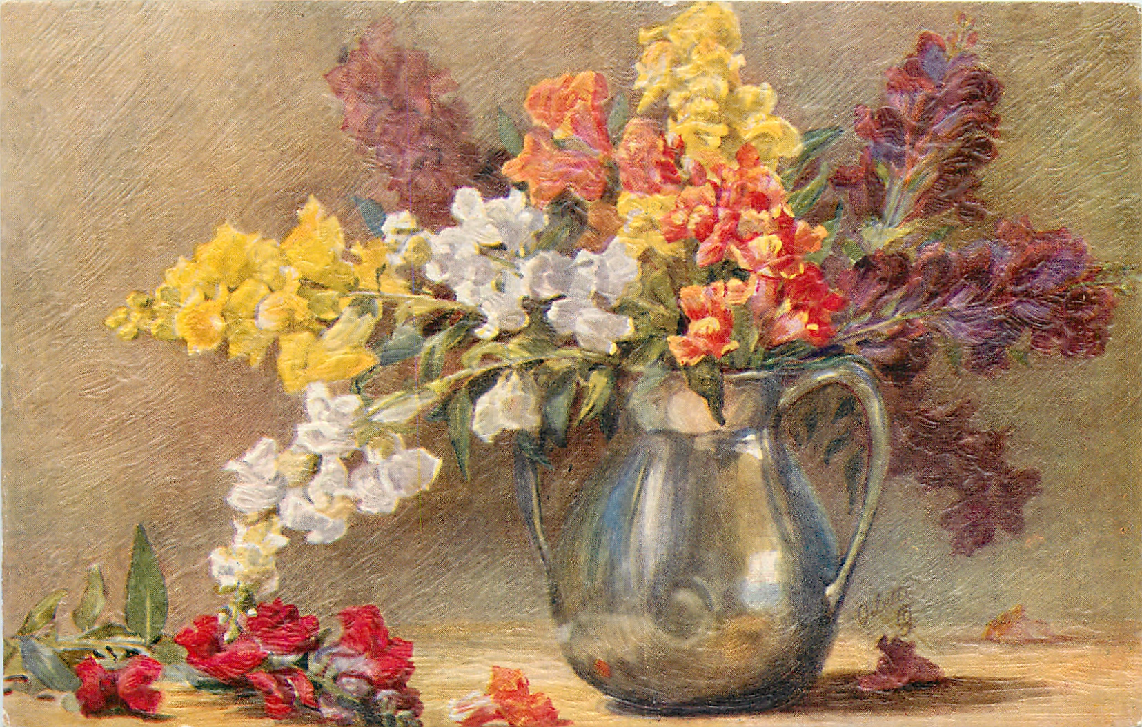 double handled pewter vase of antirrhinums of many colours, many flowers on floor left of bowl, but only two to right