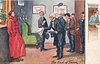 THE END OF TERM he stands in his bathrobe, smoking pipe, approached by six bill collectors