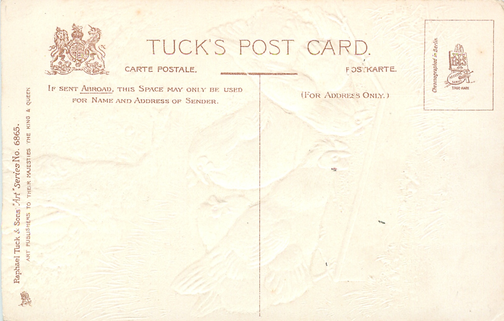 embossed, ART, CHROMOGRAPHED IN BERLIN (in stamp box)