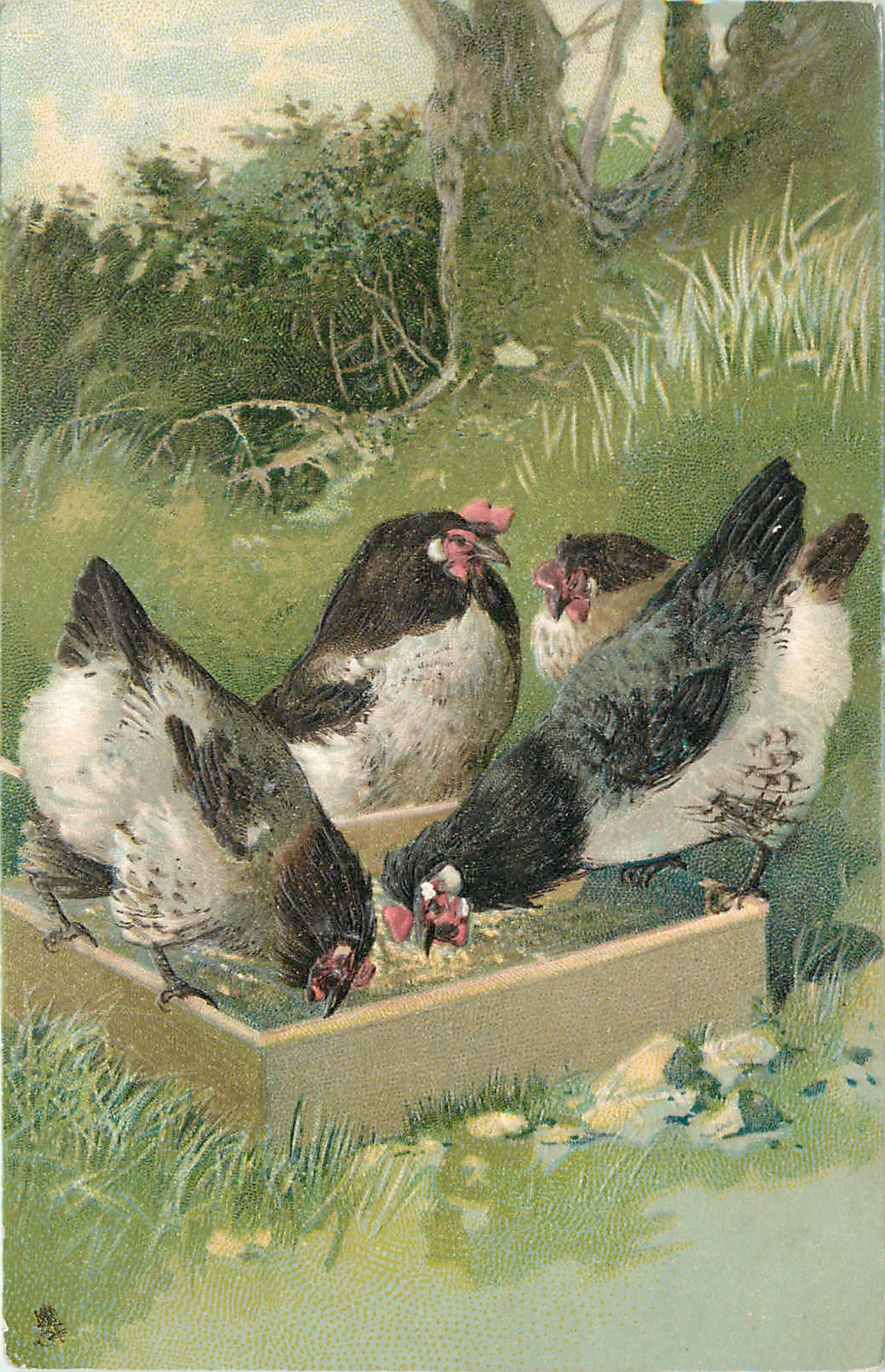 four hens feeding at trough