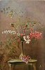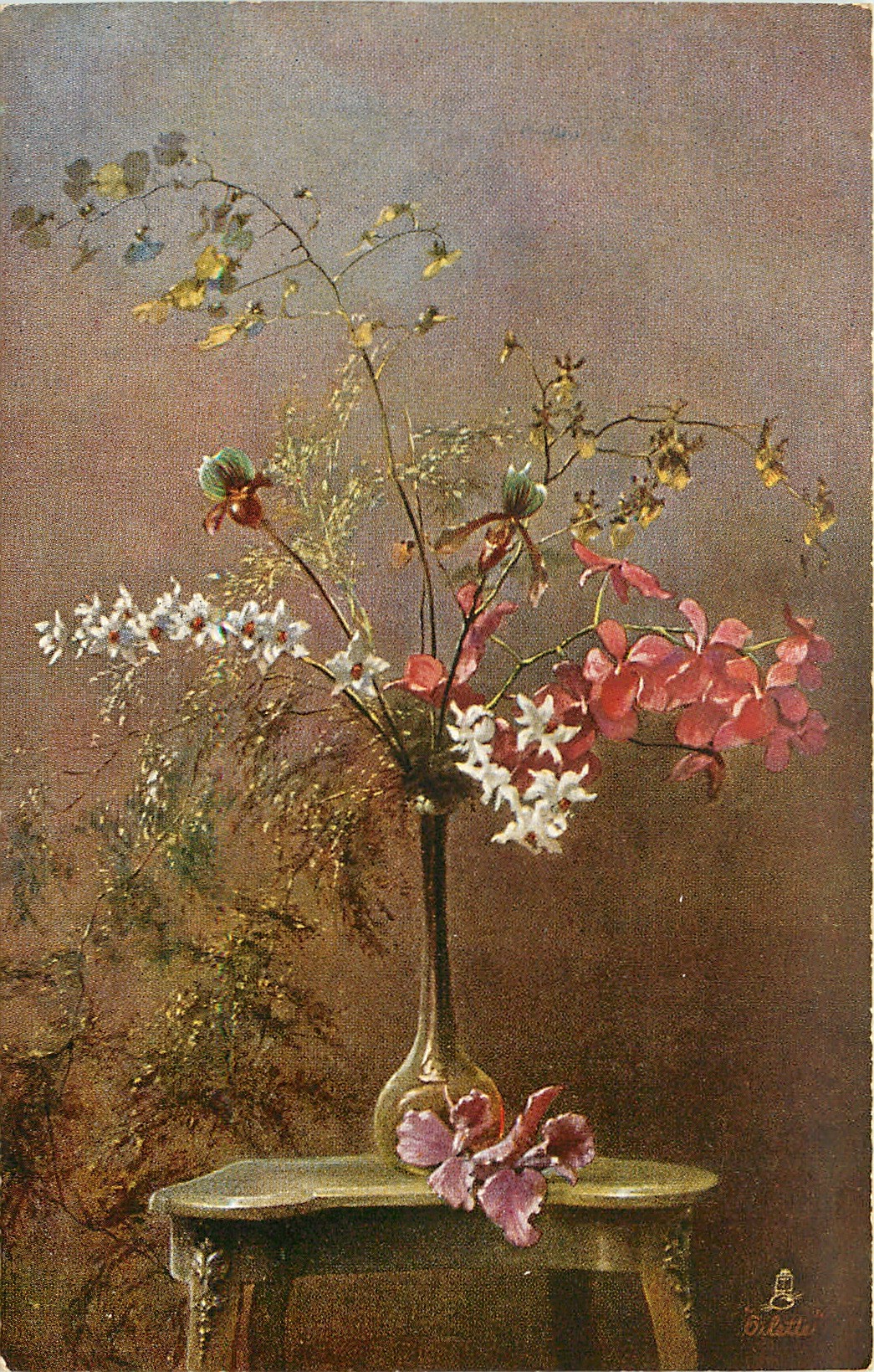 ORCHIDS arraged in tall vase, bulbous at bottom, two orchids & vase on stand