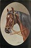 oval inset of head of brown horses head, with black mane, facing left, violets below left ear, black surround