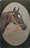 oval inset of head of brown horse, facing right, with pink rosette, black surround