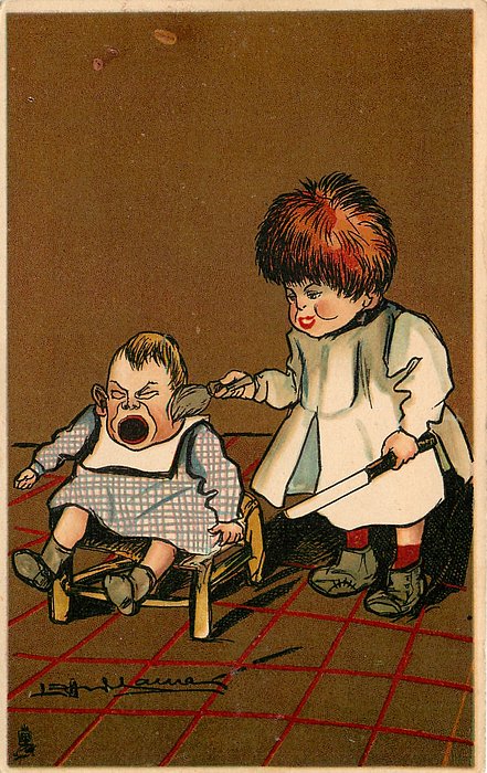 small child sits in wood chair yelling while another stands right with knife and brush in hand