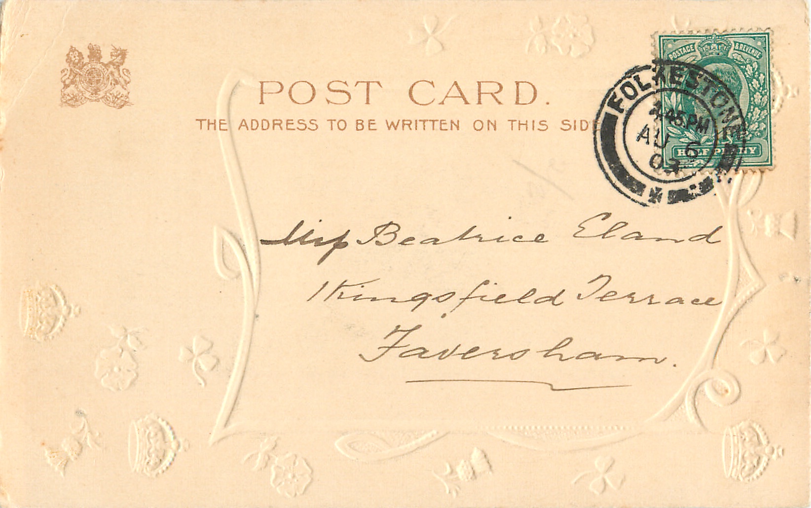 u/b, gilt embossed, shades of green background, DESIGNED IN ENGLAND, PHOTOTYPED IN BAVARIA, listed in RAPHAEL TUCK & SONS' LD. CHRISTMAS & NEW YEAR 1904/1905 catalogue