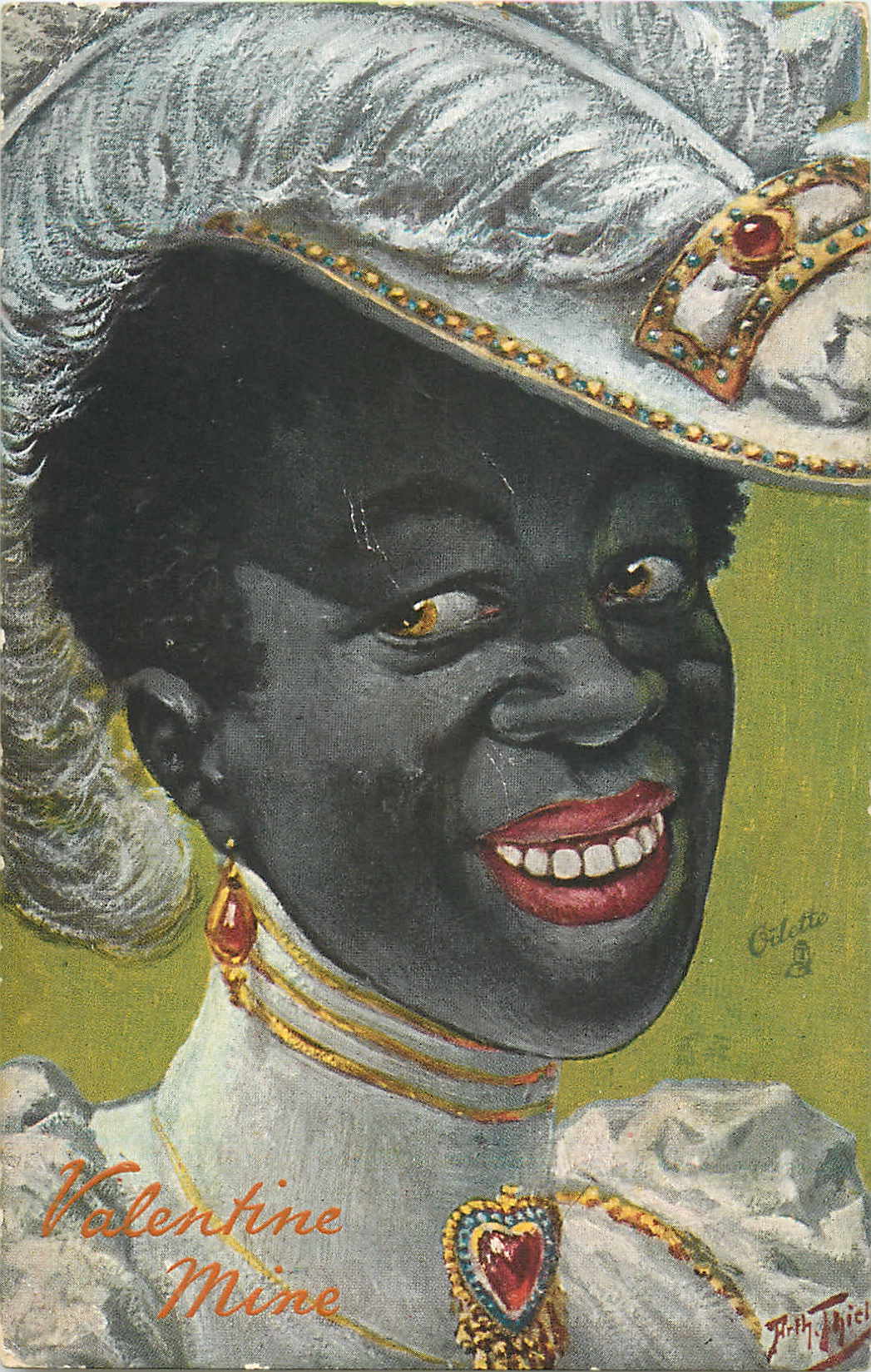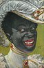 head of black woman wearing white dress with choker collar, elaborate white hat, ruby ear-ring and neck jewel