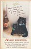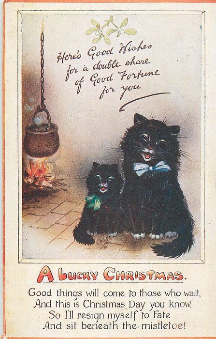 A LUCKY CHRISTMAS HERE'S GOOD WISHES FOR A DOUBLE SHARE OF GOOD FORTUNE FOR YOU GOOD THINGS WILL COME TO THOSE WHO WAIT//MISTLETOE black cat & kitten