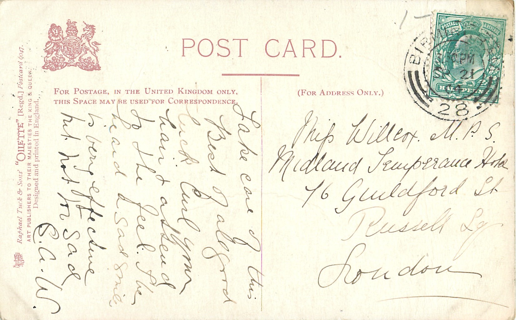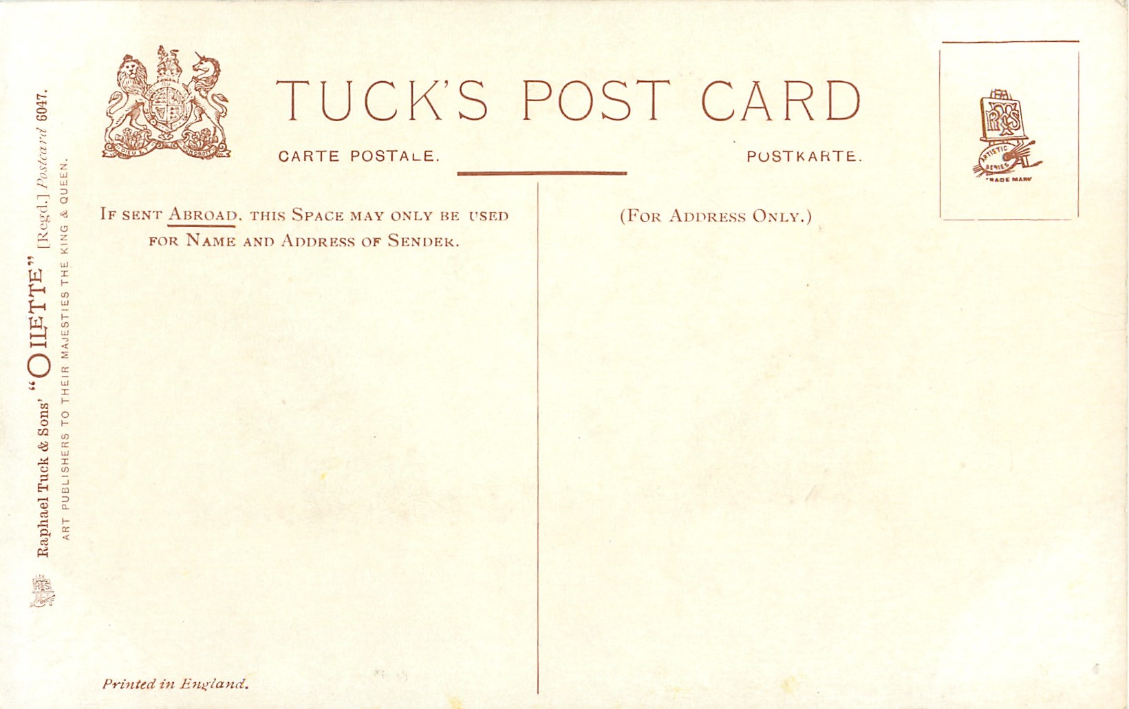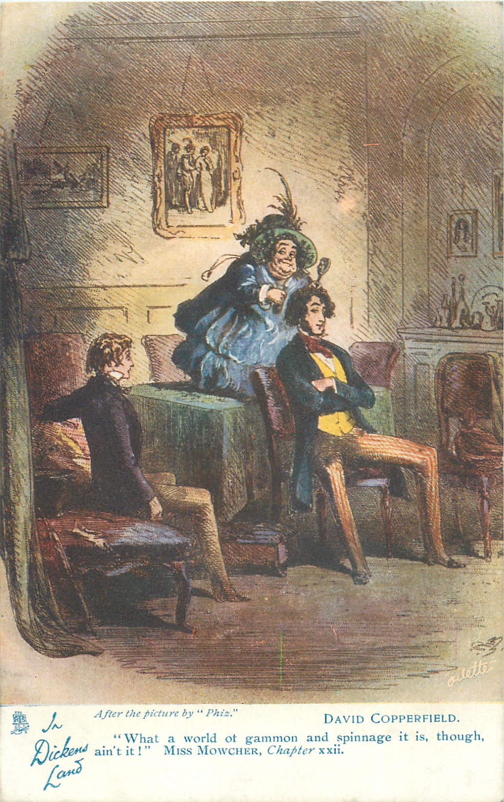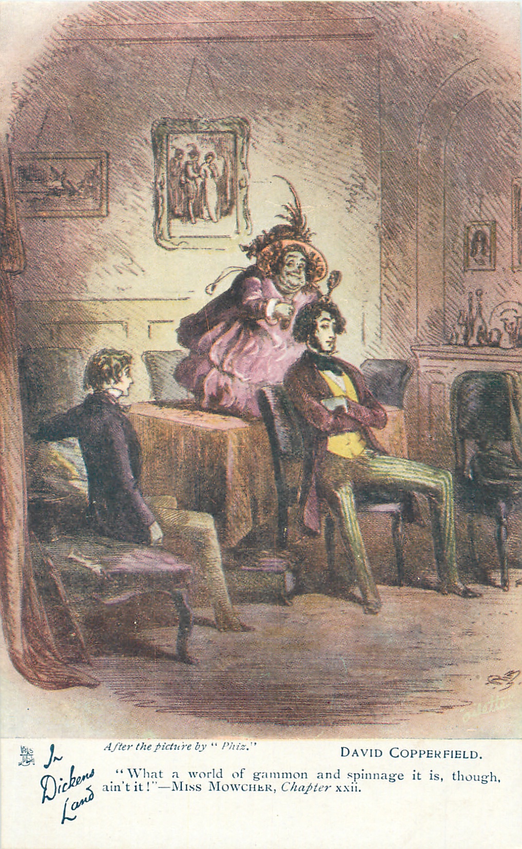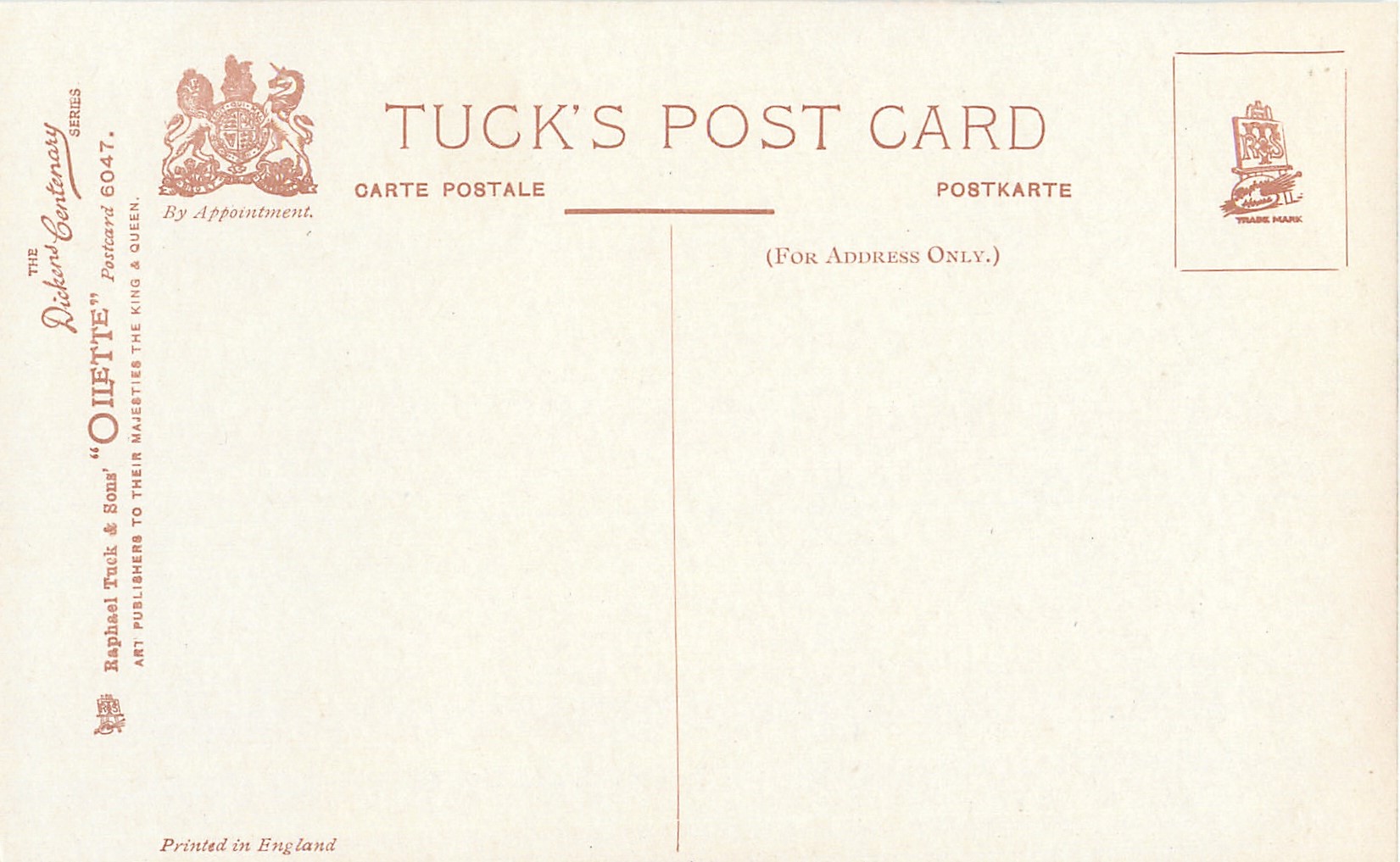 OILETTE, PRINTED IN ENGLAND, listed in 1904 & 1911/1912 & 1913/1914 Postcard Catalogues, with THE DICKENS CENTENARY SERIES (back) or DESIGNED AND PRINTED IN ENGLAND with OILETTE front in design, AFTER THE PICTURE BY "PHIZ.", with or w/o OILETTE on front, listed in TUCK'S TRAVELOGUES (USA?1905)