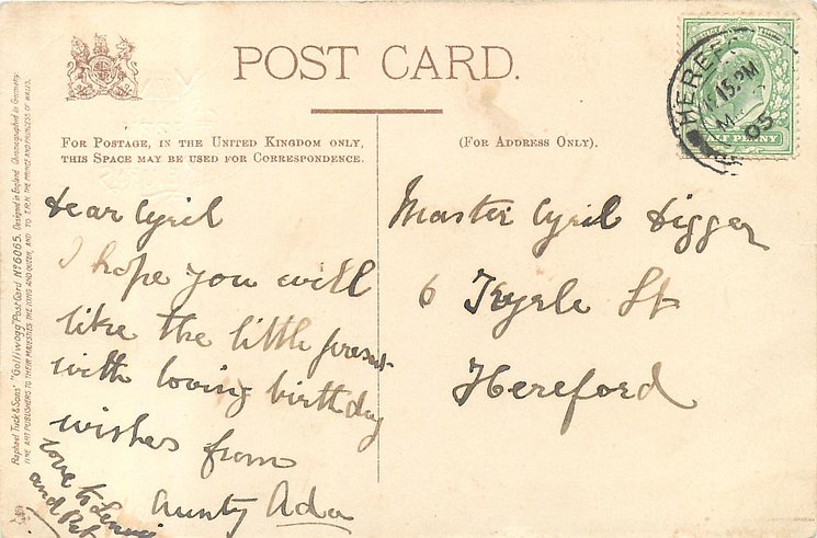 DESIGNED IN ENGLAND, CHROMOGRAPHED IN GERMANY, BY PERMISSION OF MESSNS, LONGMANS, GREEN & CO (front), series number does not appear on cards, listed in 1908/1909 Catalogue
