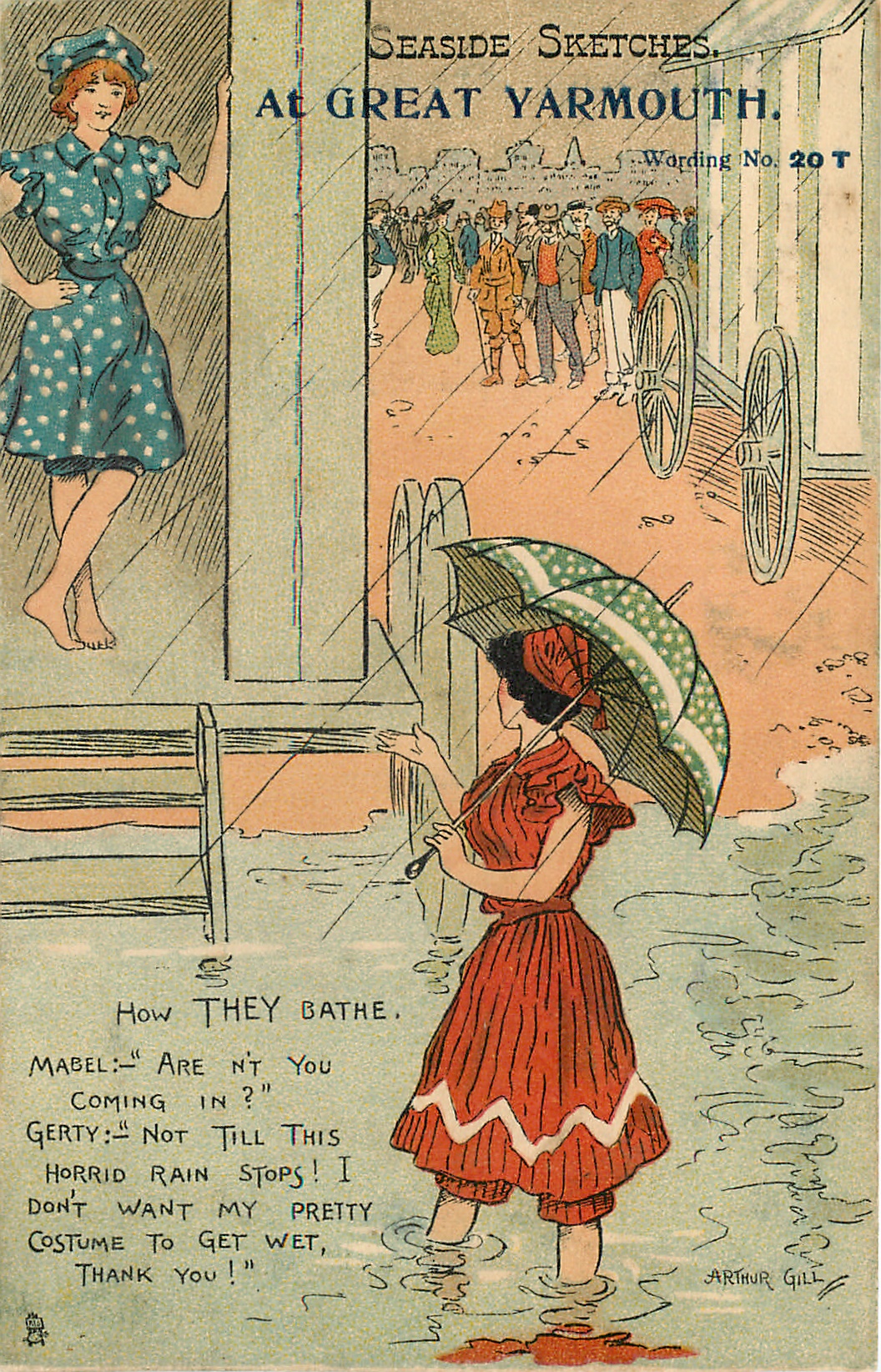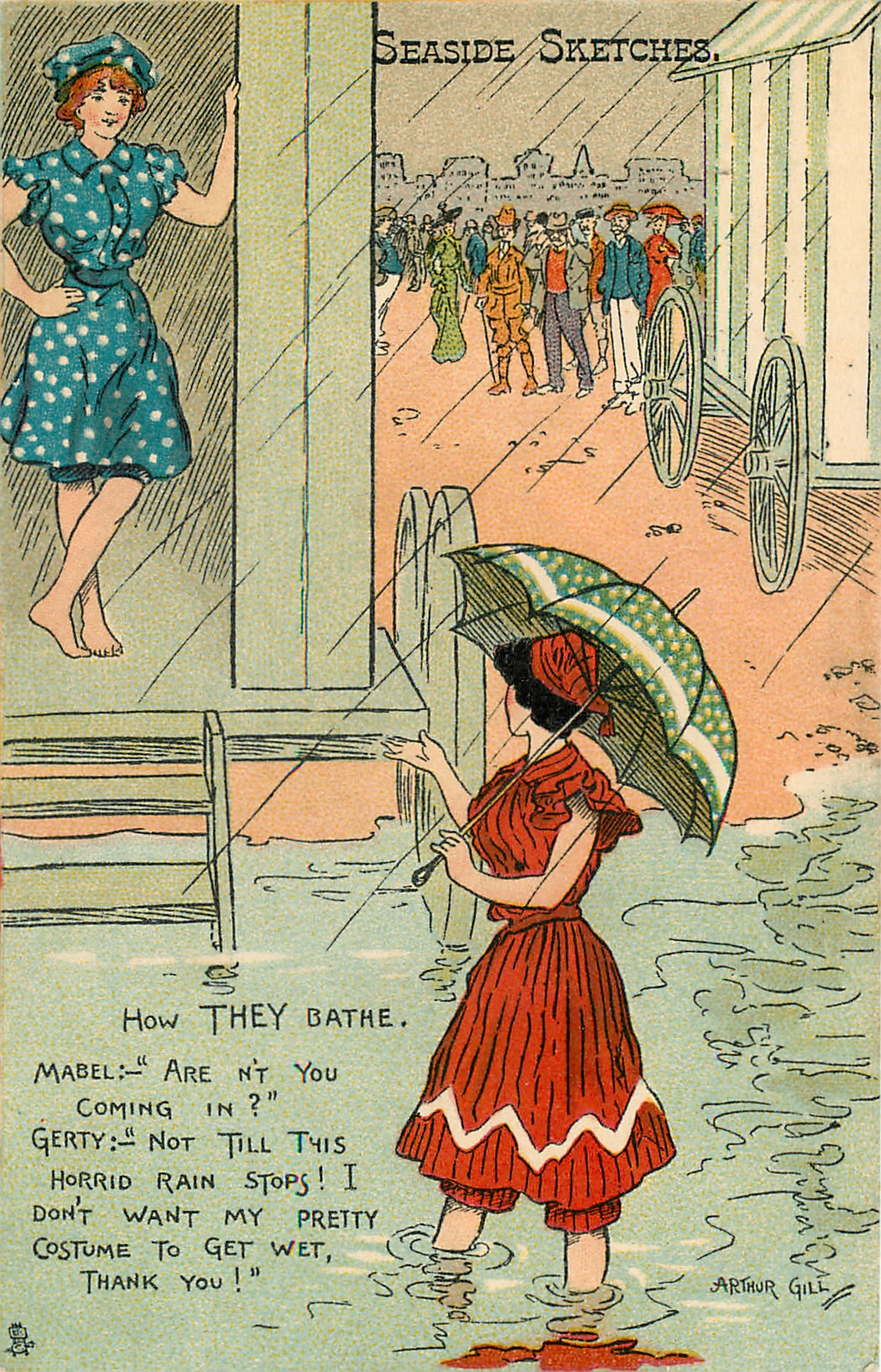 HOW THEY BATHE, MABEL:-" ARE N'T YOU COMING IN?", GERTY:-" NOT TILL THIS HORRID RAIN STOPS! I DON'T WANT MY PRETTY COSTUME TO GET WET, THANK YOU!"