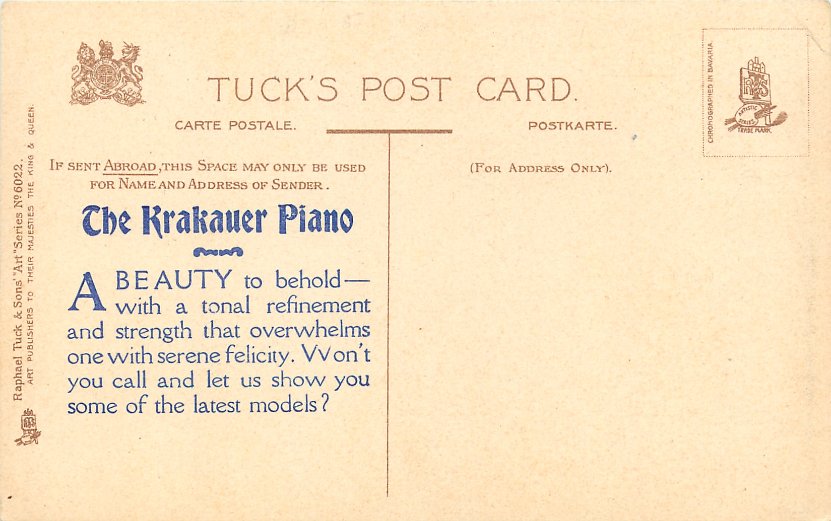 comes with THE KRAKAUER PIANO ad on back