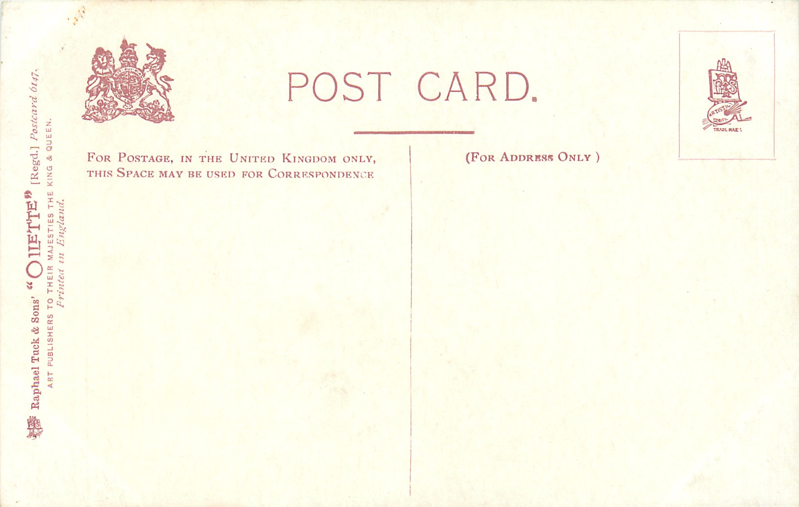 OILETTE, PRINTED IN ENGLAND, come with and w/o set title on back, listed in 1904 & 1908/1909 & 1911/1912 & 1913/1914 Postcard Catalogues, come glossy or matte finish