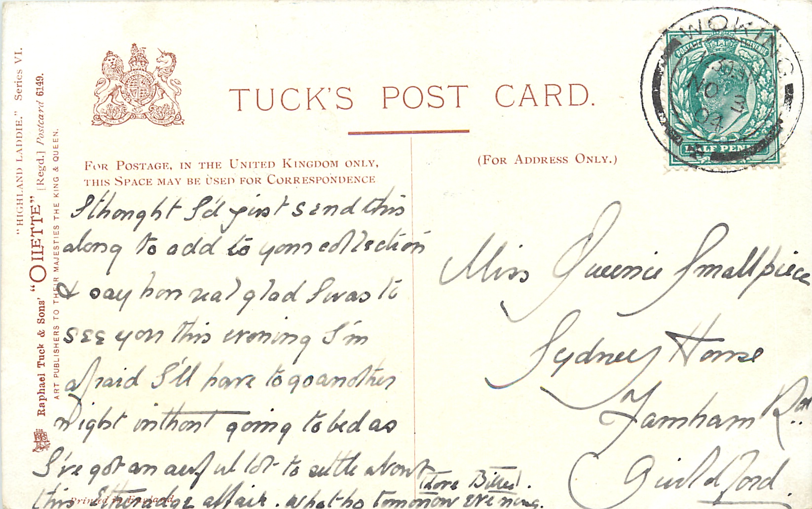 OILETTE, set title HIGHLAND LADDIE and SERIES VI. may not appear on cards, listed in 1904 & 1908/1909 POSTCARD Catalogue