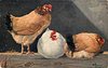 three hens, two face right,one on left stands, others sit, on fence rail
