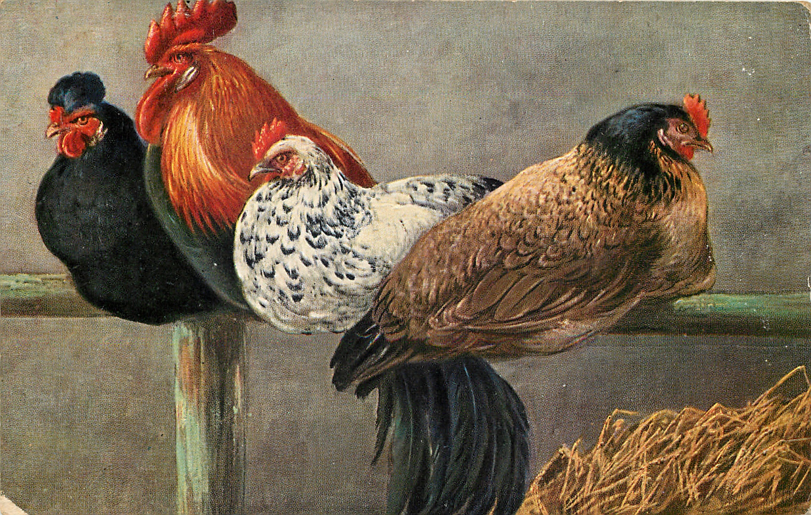 four chickens sit on fence, black hen on left, multicoloured cockerels next, then white hen then brown hen looking right