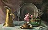 brass jug, pewter dish, rose in glass bowl, ashtray