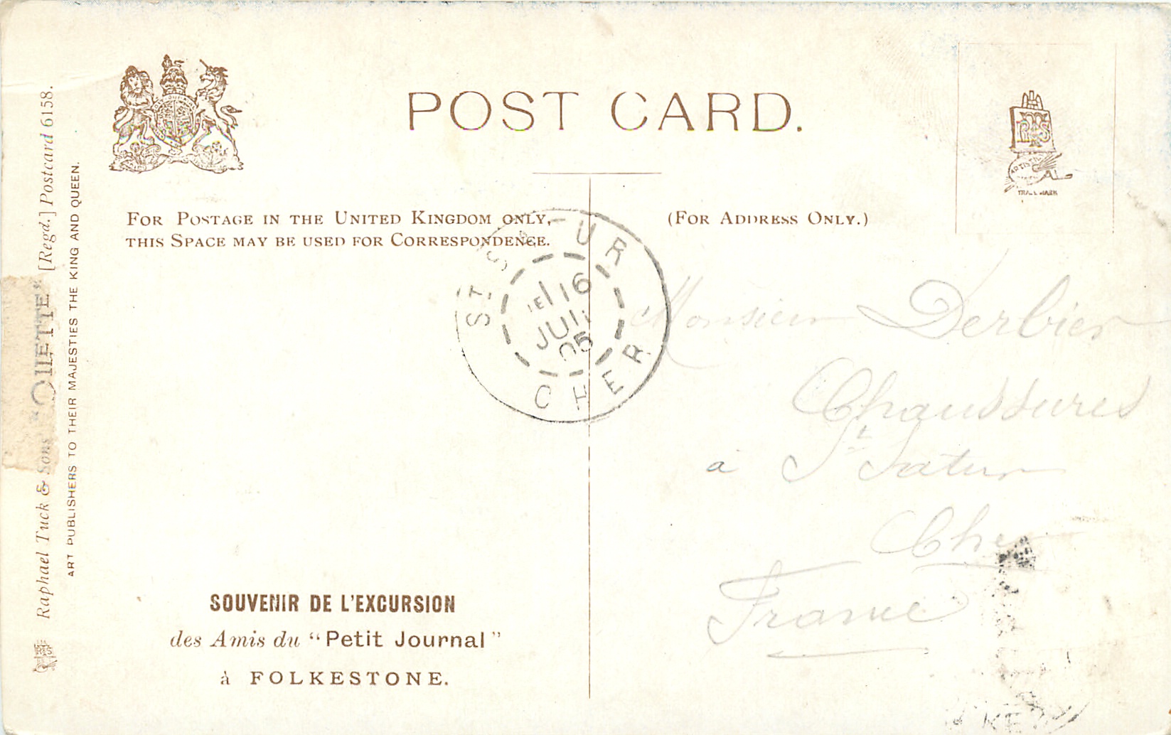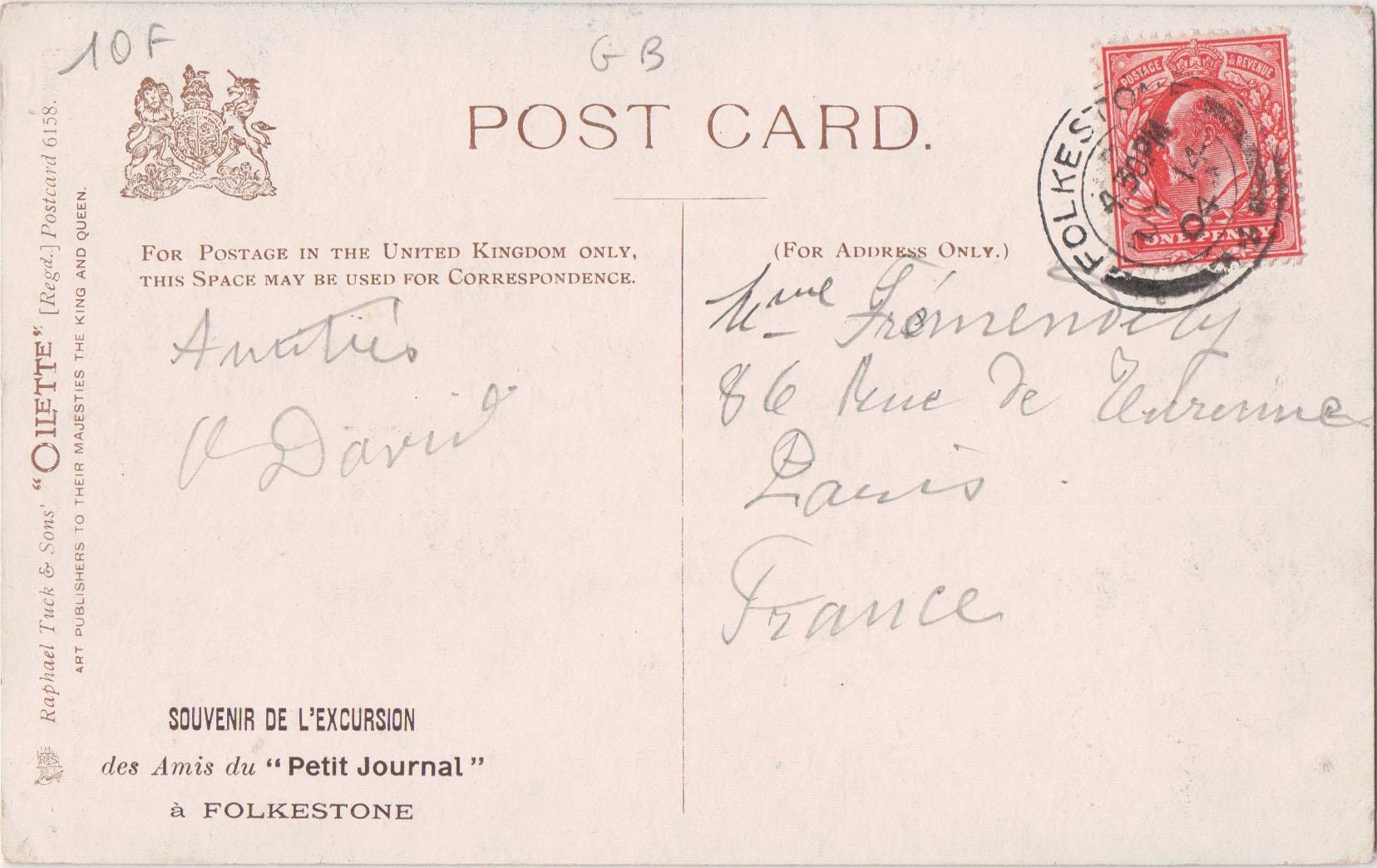comes opt. on back:-SOUVENIR DE L'EXCURSION DES AMIS DU"PETIT JOURNAL" FOLKESTONE