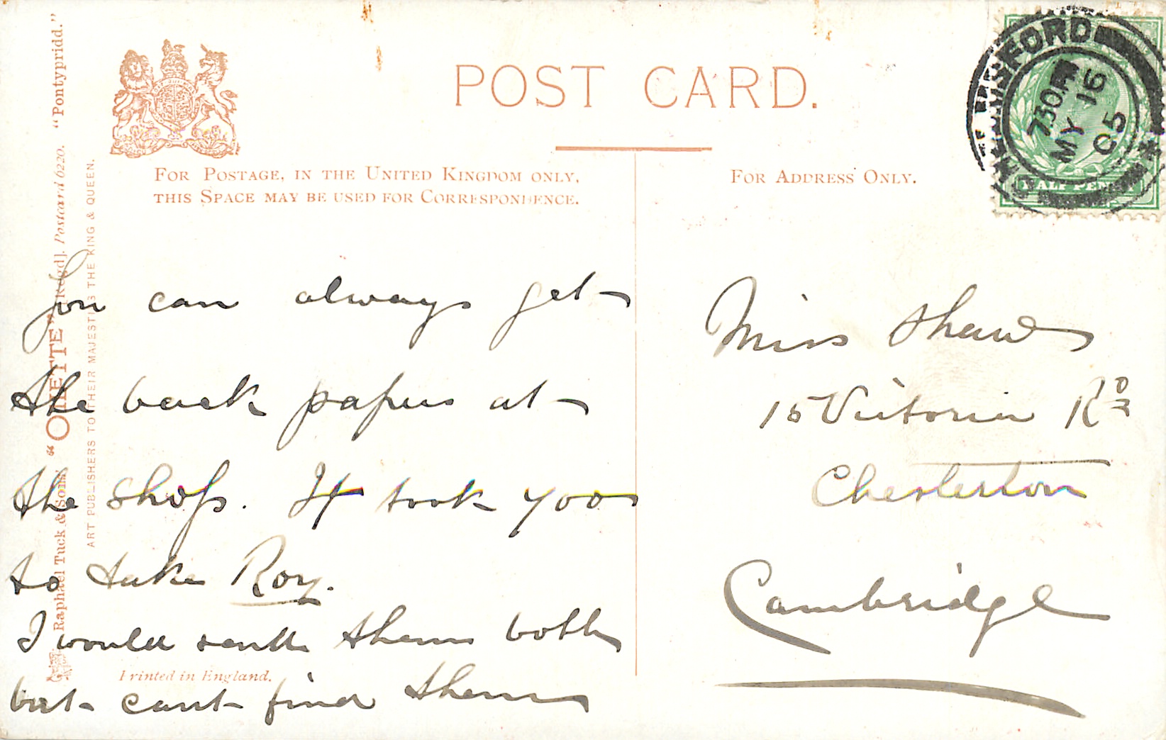 OILETTE, PRINTED IN ENGLAND, listed in 1904/1905 Postcard Catalogue