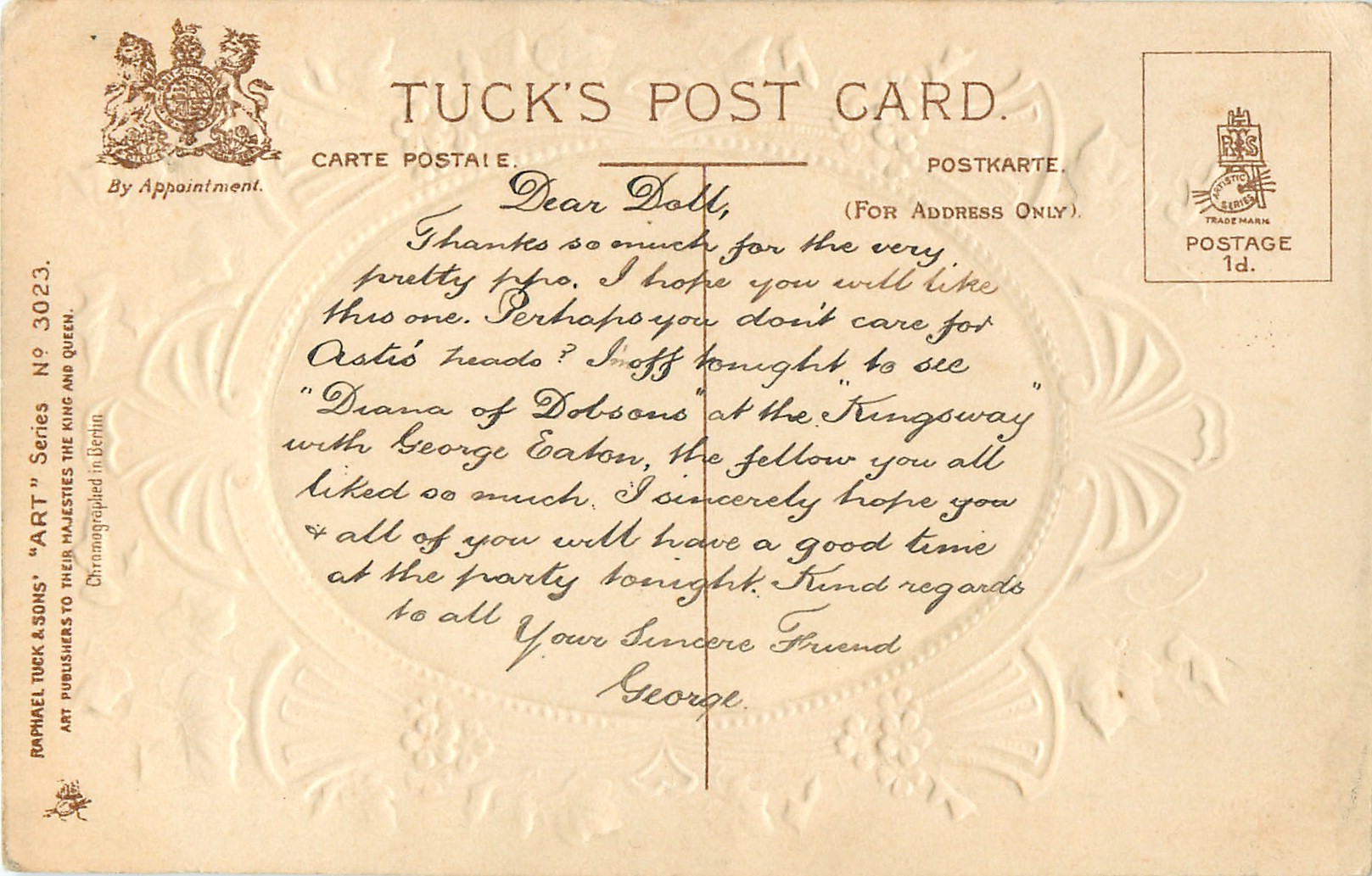 ART, SATIN PRINTED IN BERLIN (in stamp box), oval silk panels, embossed gilt & ivy surrounds, no girls names, see2731