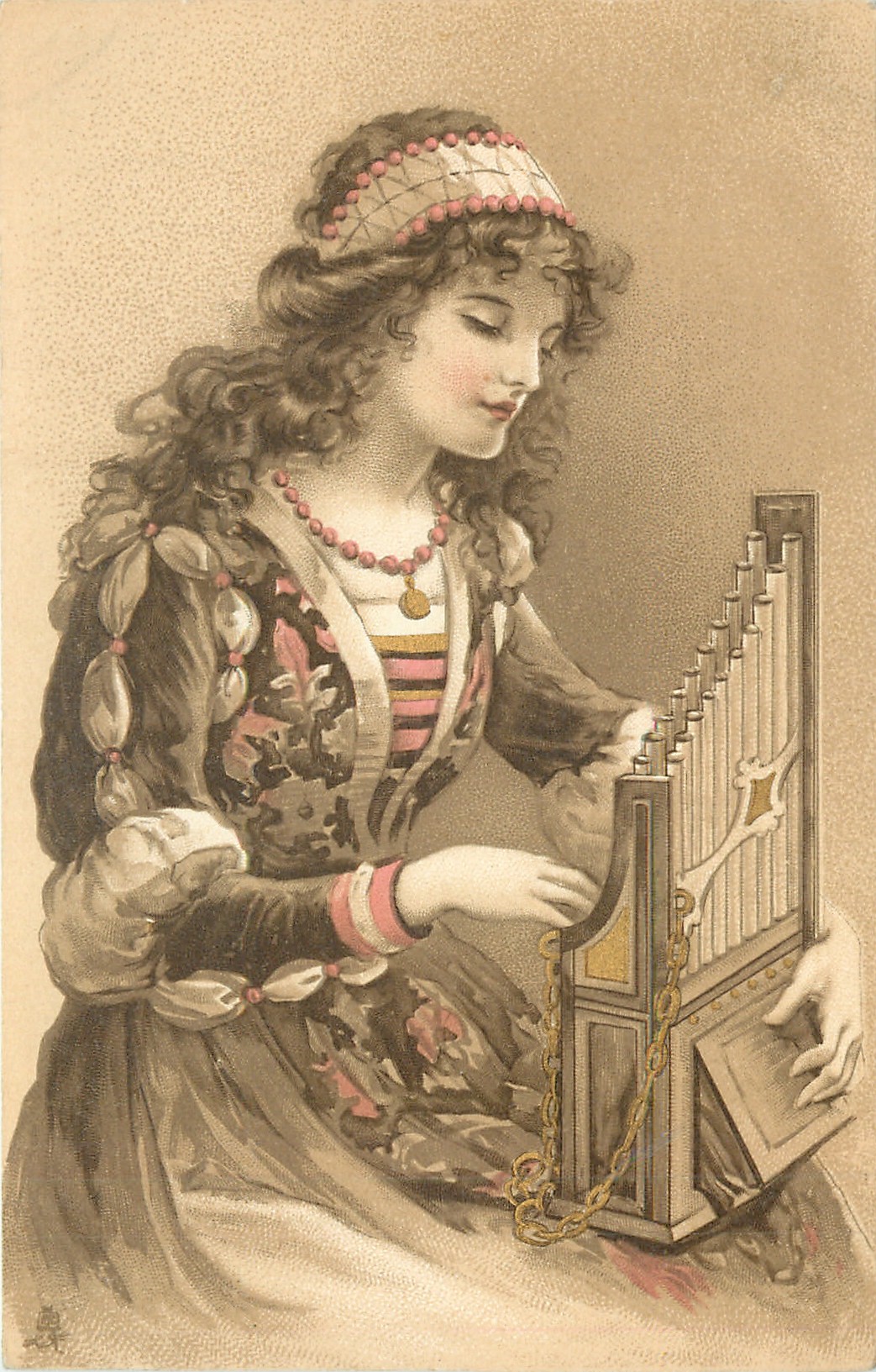 woman facing right, playing hand organ, left hand behind instrument on bellows
