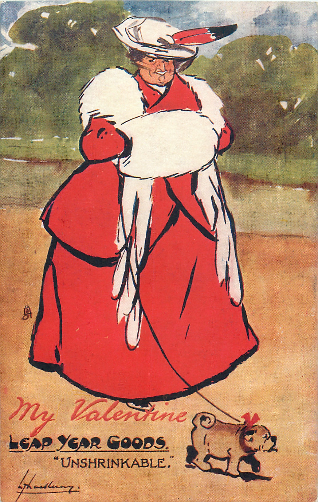 "UNSHRINKABLE" obese lady in red outfit, white muff & fur, dog on leash