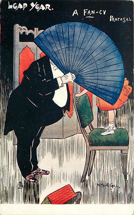 A FAN-CY PROPOSAL fat man & very small girl hidden behind blue fan