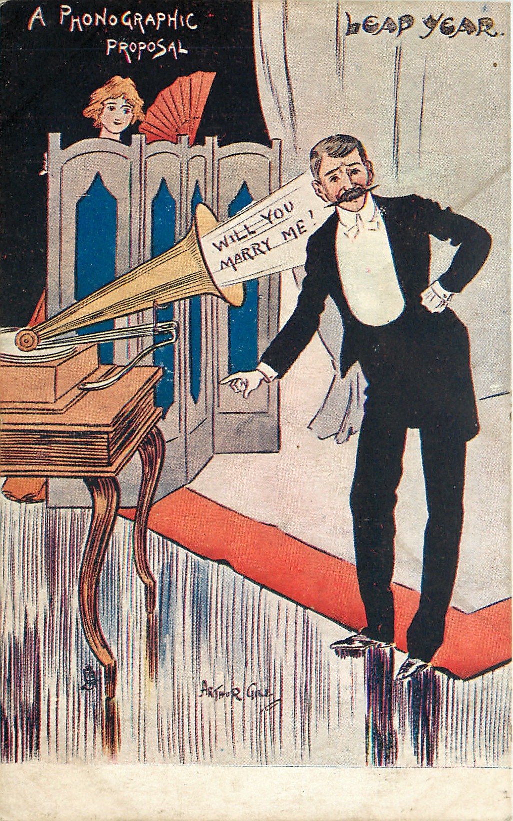A PHONOGRAPHIC PROPOSAL, WILL YOU MARRY ME! man points to phonograph, girl behind screen