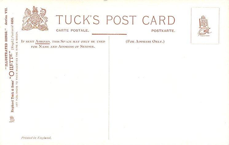 OILETTE, PRINTED IN ENGLAND, 3 backs, come w/o SERIES VII., come with or w/o verse at bottom, listed in 1911/1912 & 1930 POSTCARD Catalogues
