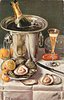 champagne in ice bucket, in front is dish of oysters with two open, glass of champagne is poured