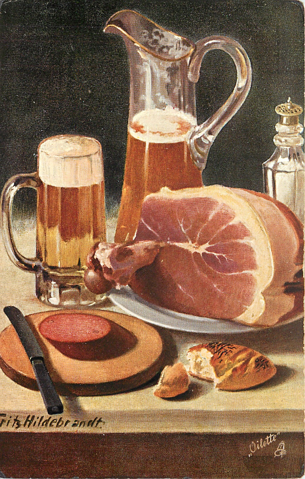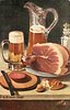 pitcher of beer alongside a glass of beer, ham on a plate, piece of salami on a boardwith a knife